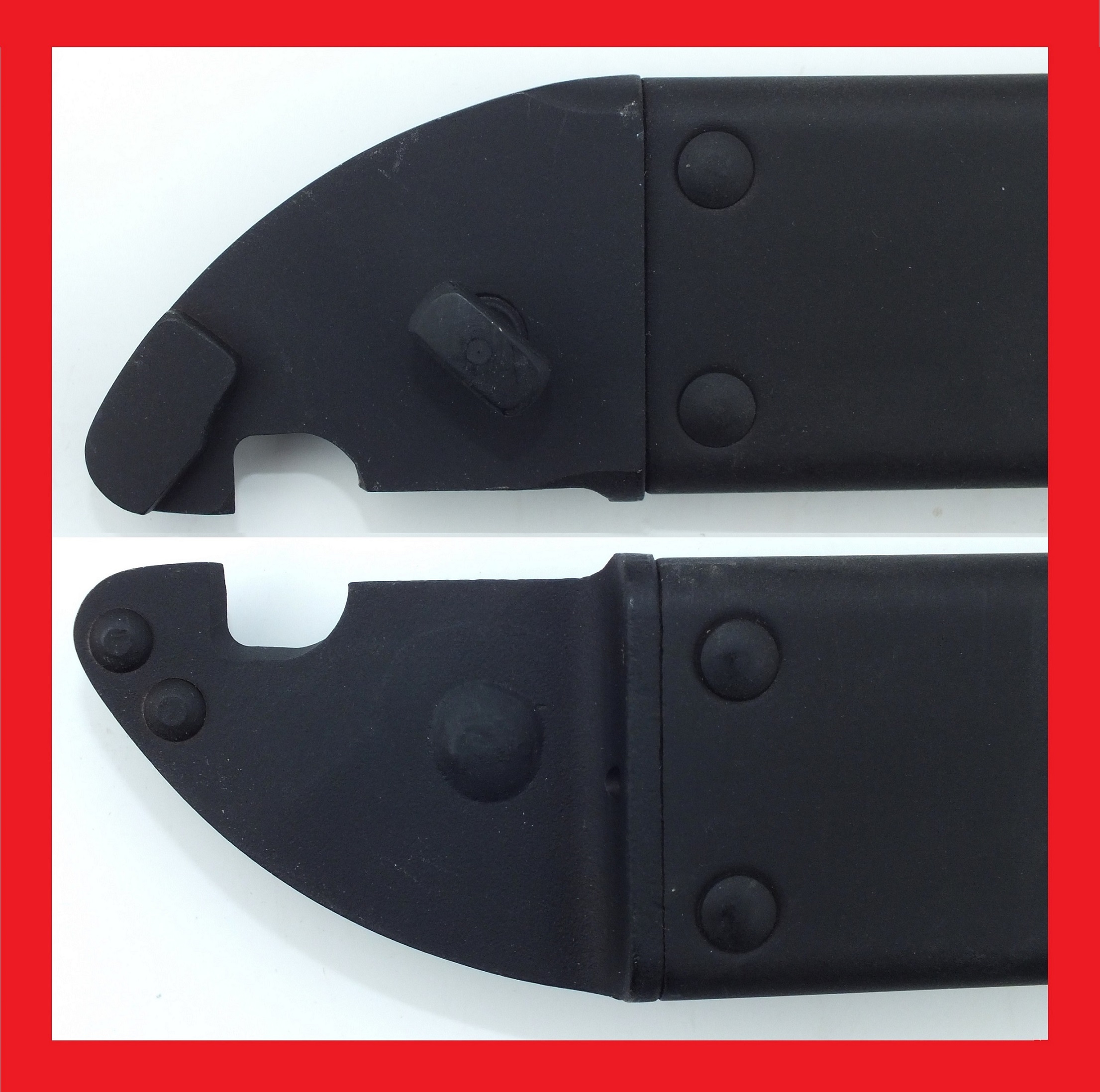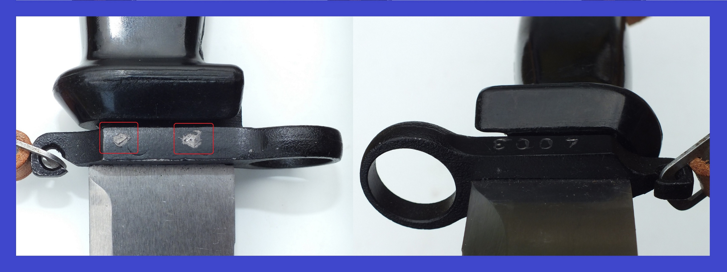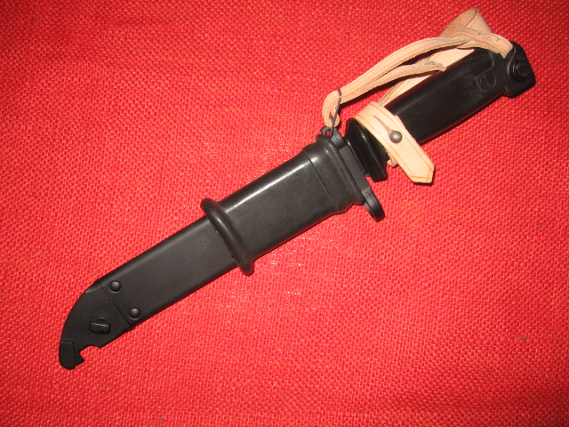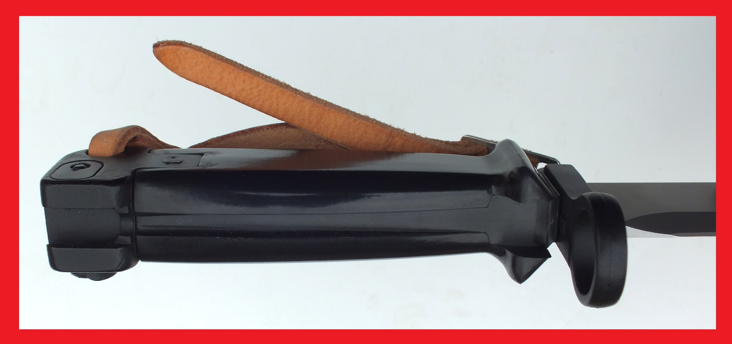 I've had several collectors state they would rather see it displayed with the more common leather hanger. I was going to display it with the newer fabric LBE hanger just because I already had one on hand. Here's the new black one with the latest set of new leather I have. Compare it with my latest old style bayonet. Also note the new style leather proof marks even on the wrist strap. M.