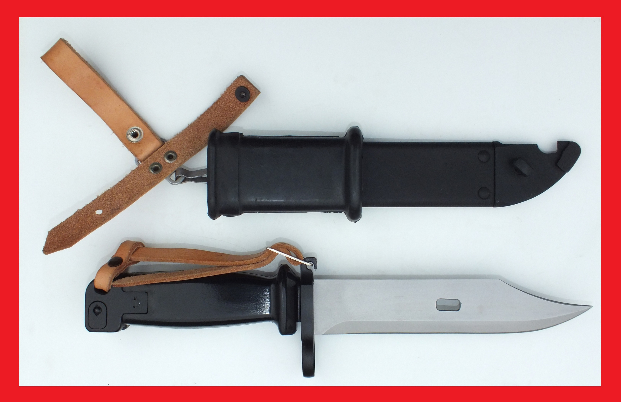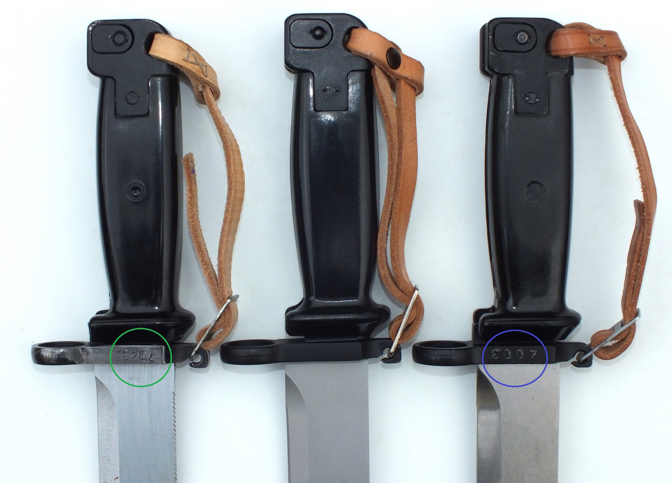 These new black Polish 6H4 Type II bayonets and Type I scabbards were designed for the WZ96 5.56x45mm "Beryl" weapons system. It is a revised upgraded NATO version of the earlier WZ88 5.45x39mm "Tantal" rifle. Which was the Polish version of the Russian AK74. The military version of this bayonet is undoubtedly numbered. The un-numbered version we are seeing I believe is for the commercial/export version of the Beryl which is currently available internationally as the "Archer" rifle. M.