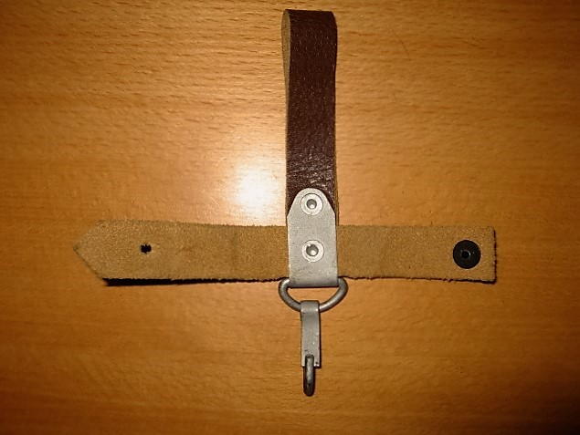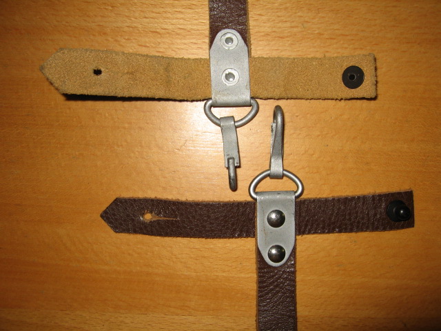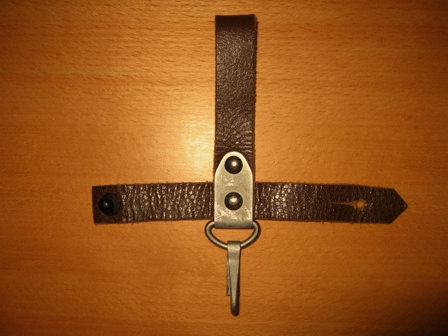 Here is another borrowed picture of the unusual hanger on one of the previous pictures of the Russian 6X5 prototype bayonets. It is shown with a Russian 6X4 Type II scabbard. Also pictures of a couple of my more common standard second type brown pebble hangers for comparison. It appears the flat stamped sheet metal bracket had a couple of small rectangular slots punched out as well as the 4 rivet holes. After the bracket is then folded over a round die, the bracket is then positioned slightly lower on the leather straps before riveting. The small slots are then opposing and provide an attaching point for the snap hook. A savings in material, no "D" ring, and assemble time. This variation would also prevent the bayonet and scabbard from swiveling around so much when worn. For some reason they seem to be quite rare. Never produced in quantity or accepted?