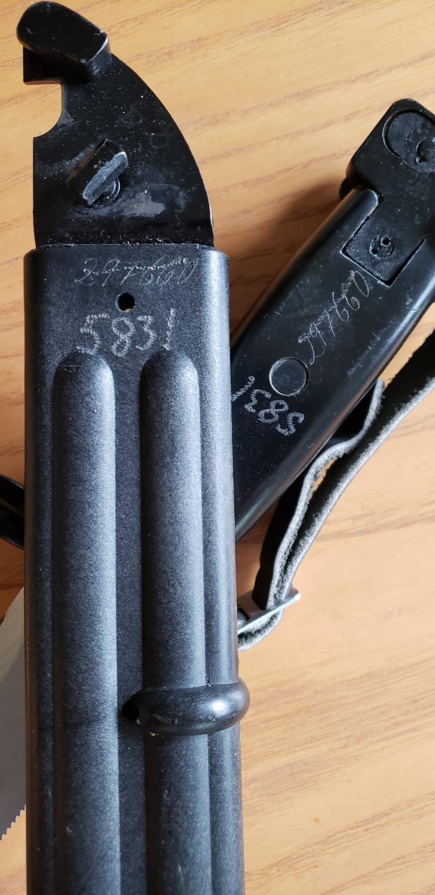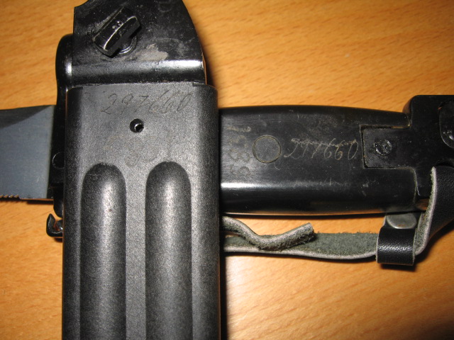 I also have few Russian 6h4 bayonets that come to Croatia during Homeland war from Bulgaria. They are interested because they are mixed IZHMASH/Tula bayonets with restamped serial numbers. In Bulgaria they were repaired, old serial numbers were removed and new 4-digs were added. These were last 4 numbers from rifle's serial number. Same restamped serial number I found on German M1974 model that also come from Bulgaria.
