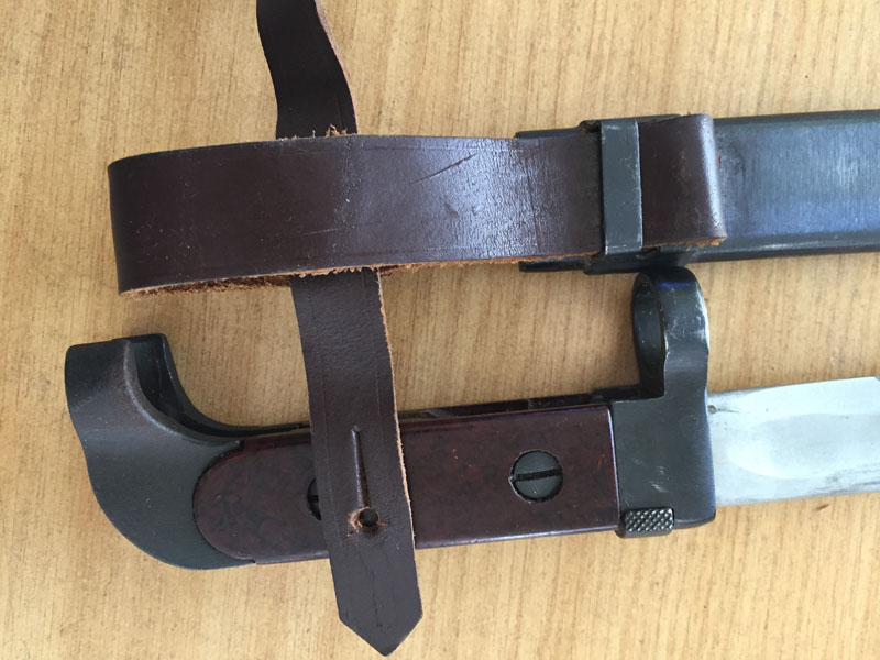 The leather seems newish to me. But with the overall condition appearing excellent, with no signs of a rework, I was wondering if maybe Romania bought these for issue, or maybe bought bayonets and fitted them with hangers and serials?