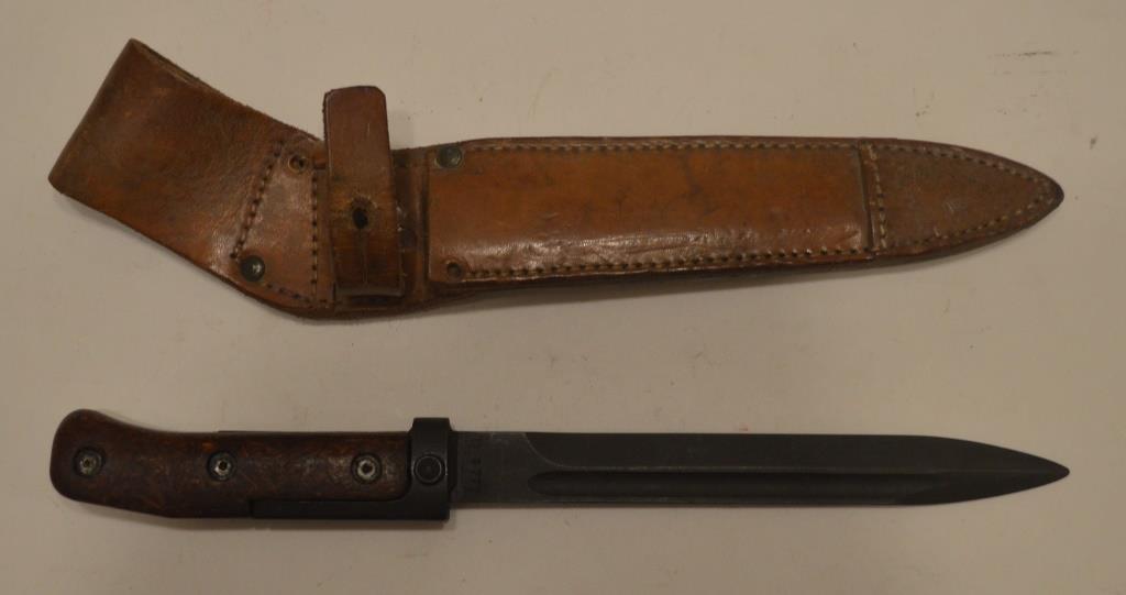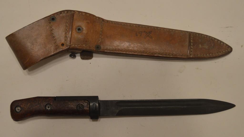 Another bayonet I picked up at SAR. This one is a Czech VZ58 variation I had not previously seen. It is the early style (in fact the scabbard is dated 1961) with the short tang and rounded hilt. This bayonet is unusual in that it has three rivets visible in the grip.