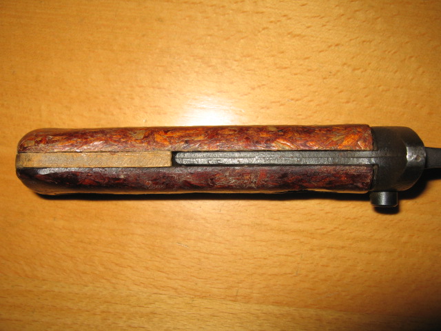 Here's one of my versions of a repaired/reworked Type II with three non-standard rivets. The original wood chip and glue Type II molded grips have been replaced with Type III flat grips by using a non authorized wood filler. The authorized repair would have been Type II grips with standard two rivet placement or Type II grips with the authorized welded on tang extension. M.