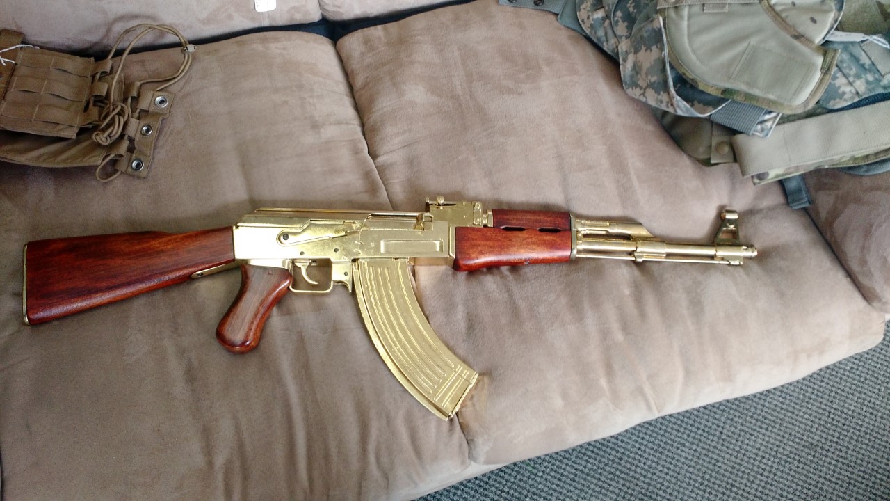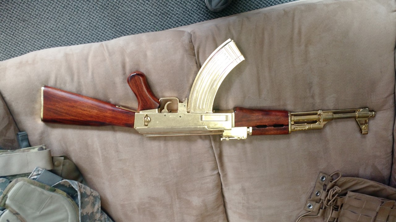 Here's another all metal and wood replica AK47 I found last weekend on the Illinois side of the Mississippi River. Very realistic look and feel and a completely different design and construction than the previous one. Plus all the metal has been gold(?) plated. Maybe from a South American drug lord or a middle eastern dictator?