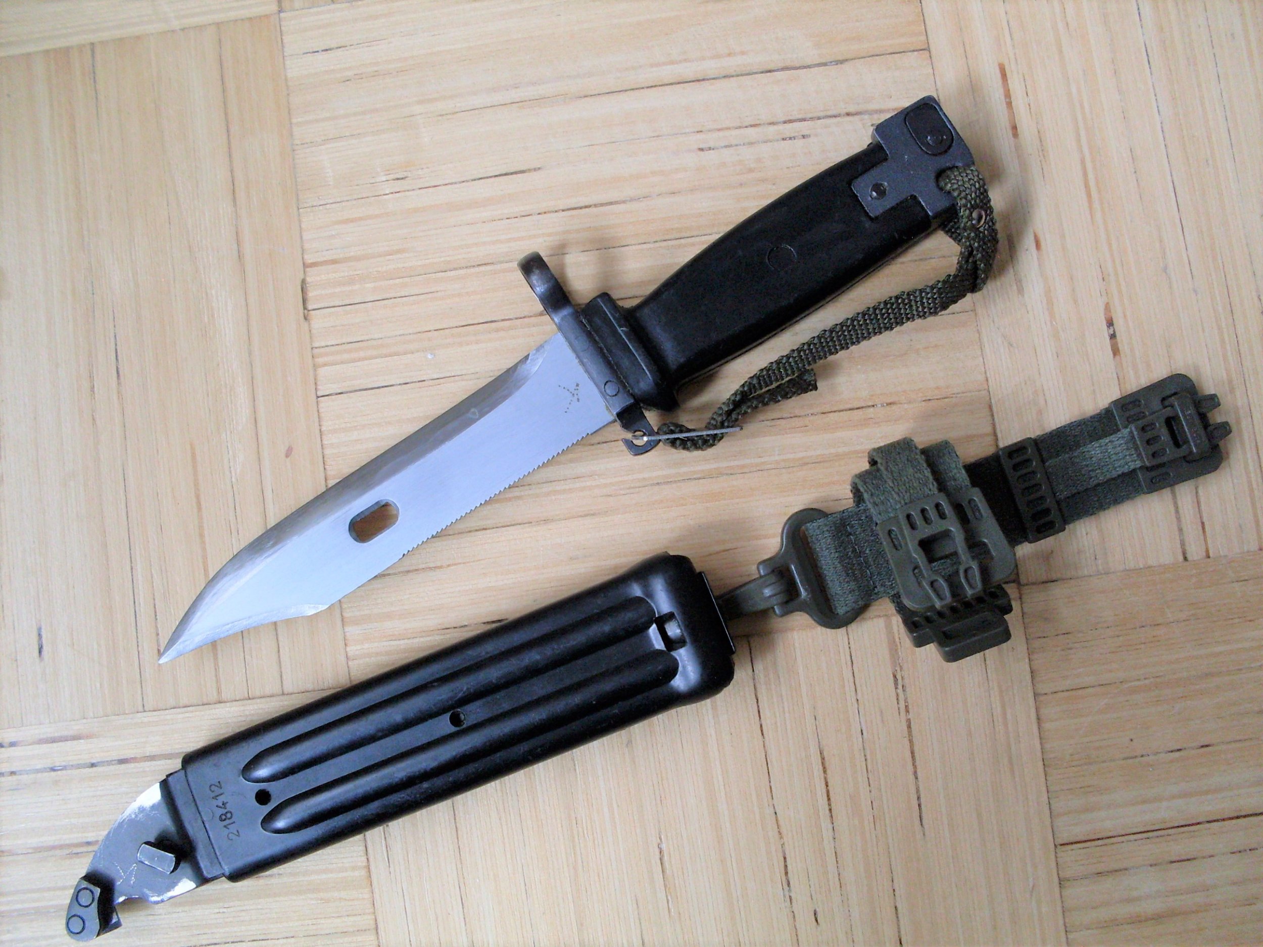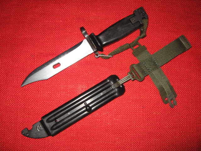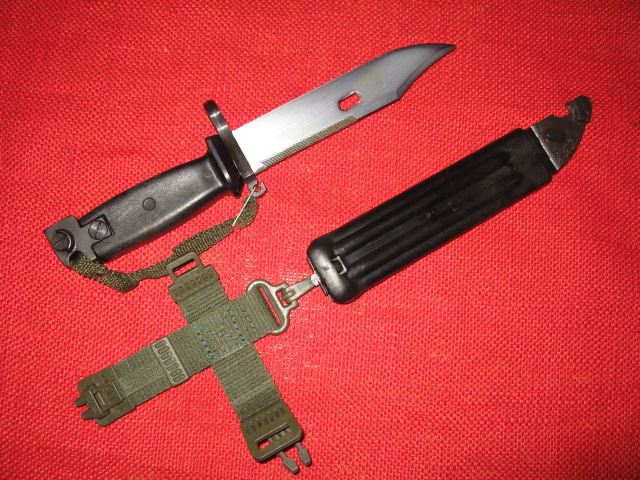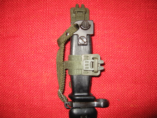 I have seen this AKM 6X4 Type II bayonet & scabbard displayed many times over the last 15 years or so. It is commonly identified as Slovenian due to the unusual hanger and wrist strap even in reference materials. However, I have never seen any official providence or confirmation of this. Most commonly this hanger and strap are displayed/pictured on a Yugoslavian AKM 6X4 type II (M70) bayonet and scabbard. I have seen it with the usual Yugo issue numbers and the R-code ones as well. This raises the question of who makes and or issues these hangers and straps? All the ones I have seen are like new, never used. Possibly made up for the collector's market? Why the Yugo bayonets? Are they purchased and used by Slovenia? Lot's of questions, anyone have any additional information?