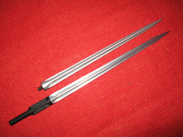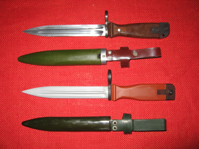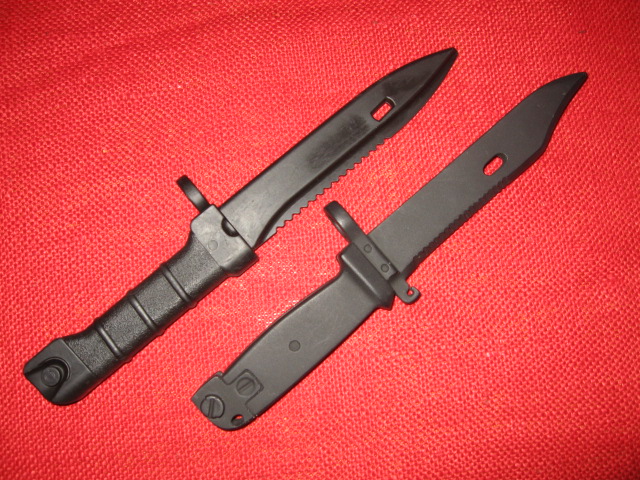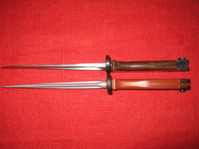 Here's one more 'training' bayonet that I'll post as a replica/toy as I don't believe is actual military. It's a copy of the Chinese Type 81 bayonet and scabbard. The blade is flexible rubber the rest is molded plastic. It does however have a functional plastic catch assembly. The molded plastic hilt is all messed up with the catch on the wrong side and the top and bottom reversed as well. Here it's shown with an original Chinese military issue Type 81. Mike