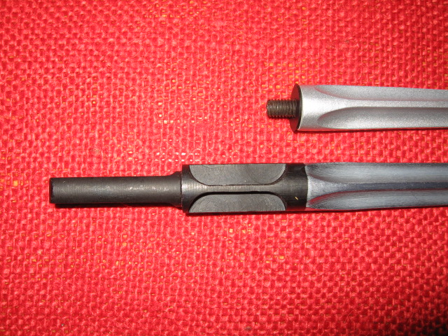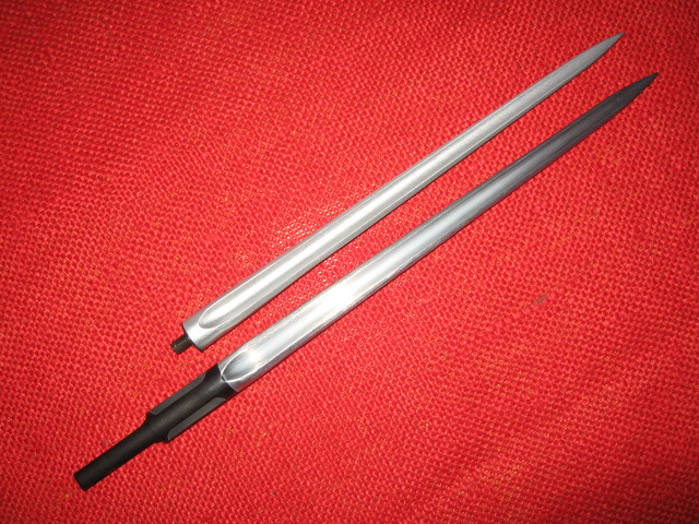 Here's another 'toy' bayonet I picked up recently. This one was hard to pass up since I have a sub-collection of 15+ Chinese Type 56 folding spike bayonets. This one is made specifically for a plastic and metal Airsoft replica pellet gun as an accessory. It is made of aluminum and the blade is an identical copy of the original one. It is designed to screw into some type of hilt on the rifle and I am not sure if it is designed to fold like the original. It is pictured below with an original for comparison. Mike