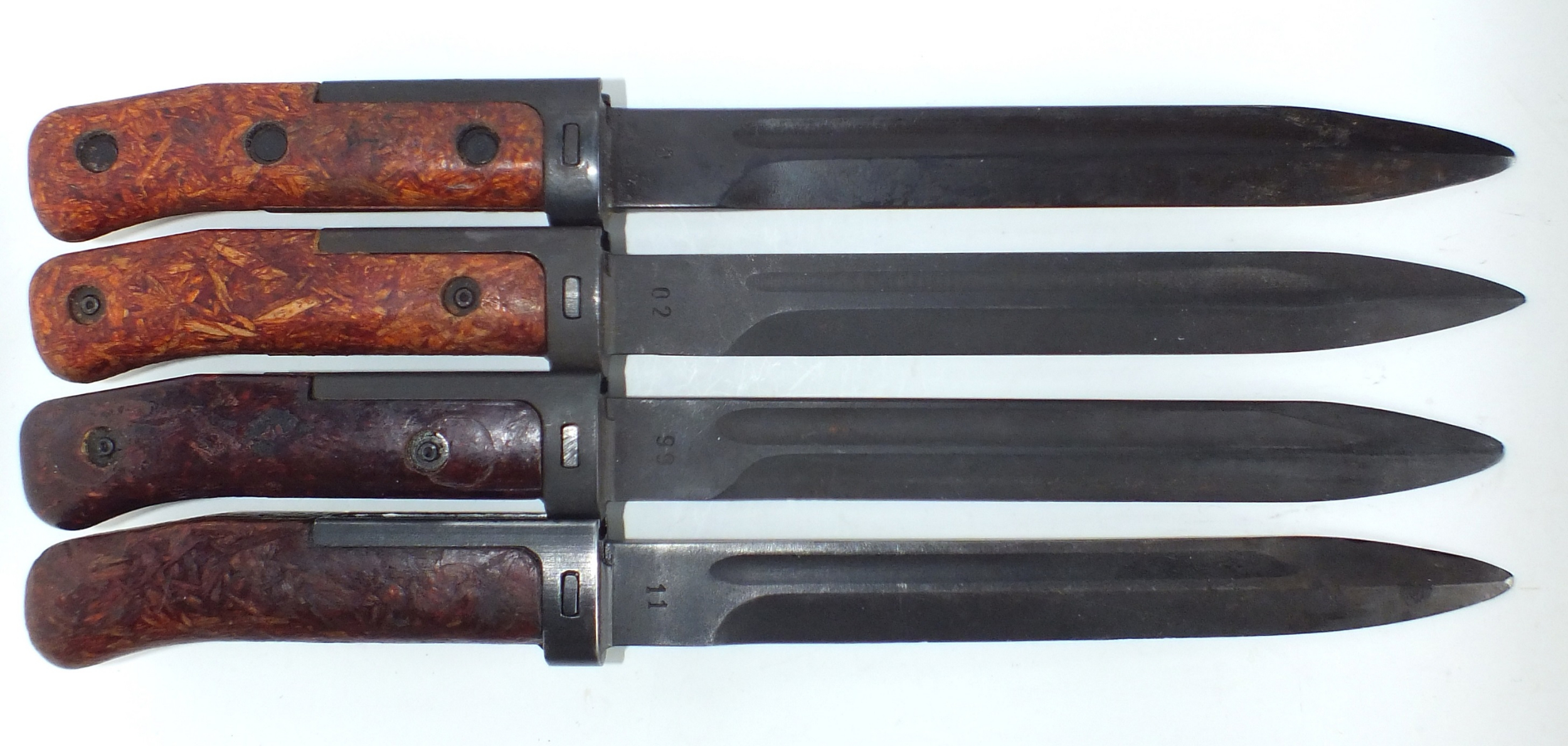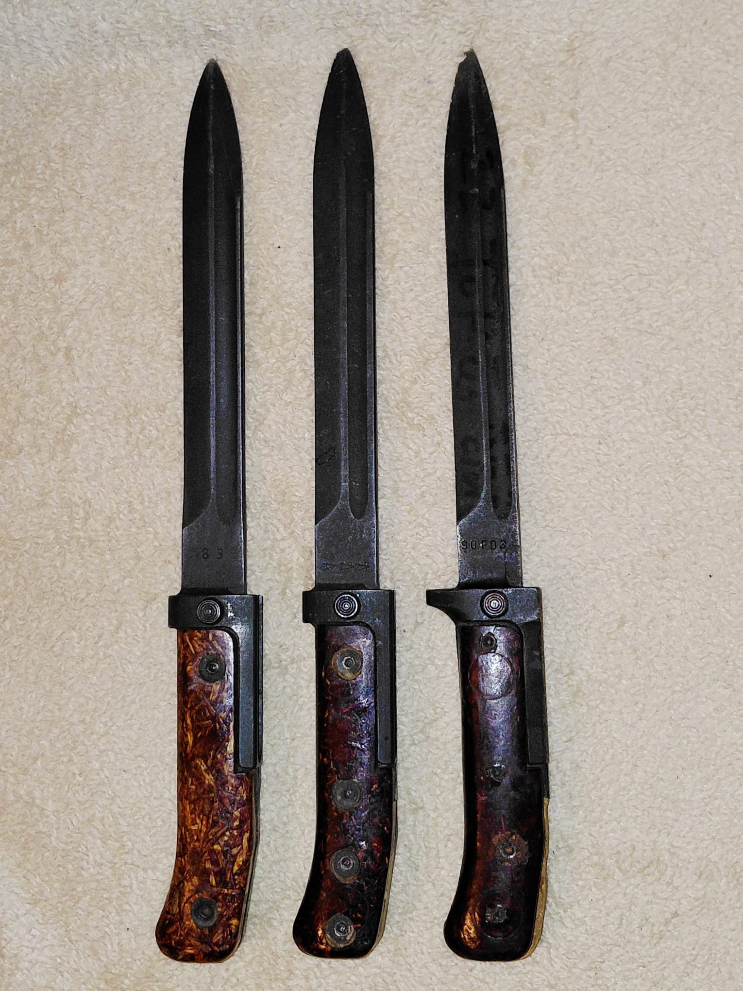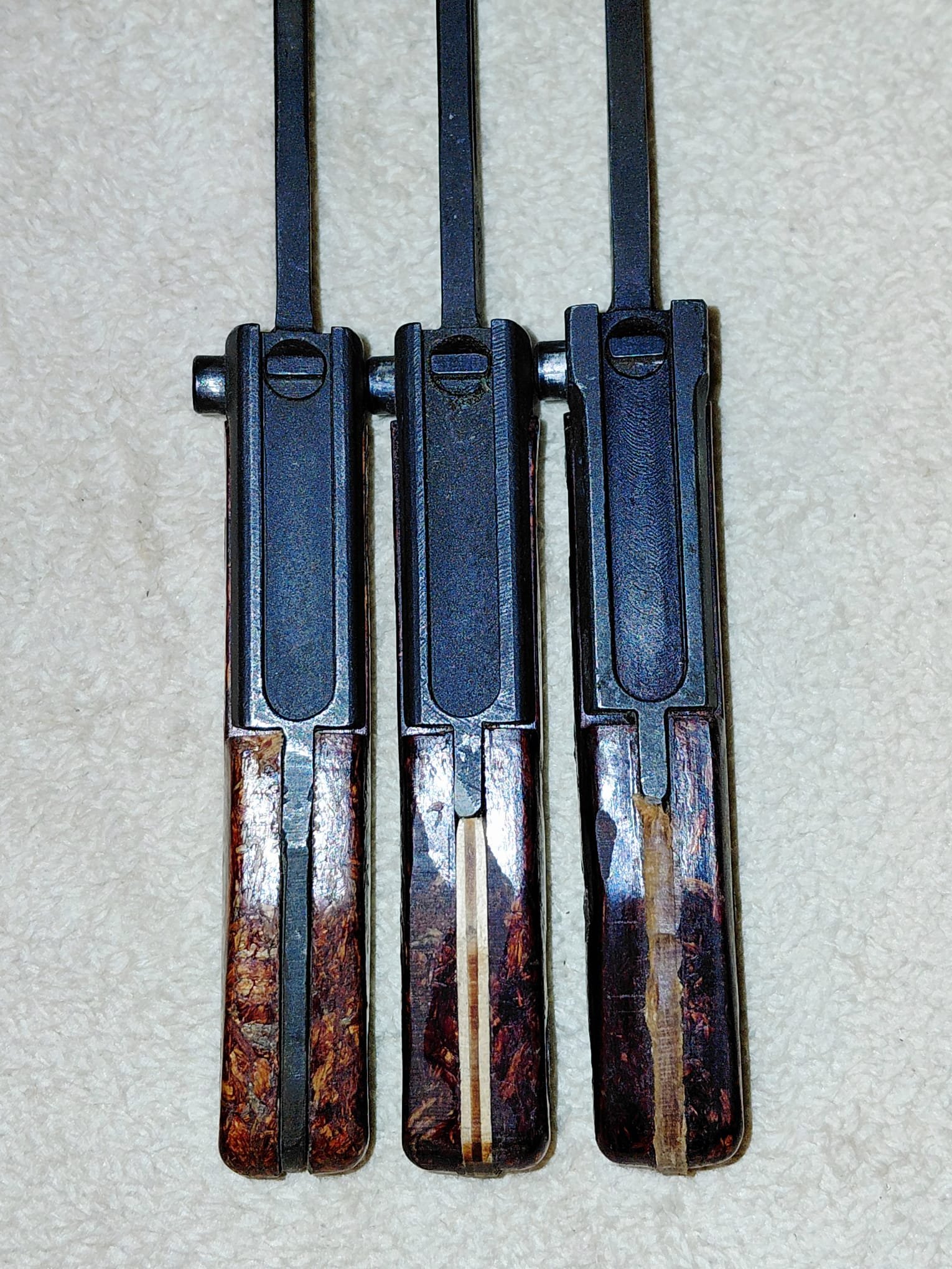 Gerhard, the very first bayonet at top of your post appears to be a very nice original VZ58 bayonet with a wood grip. The rest of the wood handled ones pictured may well be reproductions in my opinion. I say this as to my knowledge from references and sources in Czechoslovakia, The wood grips were only used on the early Type I bayonets and were soon discontinued. This was due to issues in manufacturing and installing the grips. Difficulty with fit and finish as well fragile and prone to splitting/ breaking during installation. They proved to have the same problems during issue and usage. The wood did not do well during weather changes, worked loose and were easily damaged and made unusable. They were discontinued in production and recalled and replaced during any inspection or rework. This information comes from an armorers manual. It is also safe to assume the a wood grip would rarely be used as a replacement during rework except perhaps on very early items before replacement grip panels became available. Even then the rivets would have been similar to the original ones. If all this information is correct the wood grips were never arsenal installed on the revised Type II bayonets and would not have been used on them during any subsequent rework.