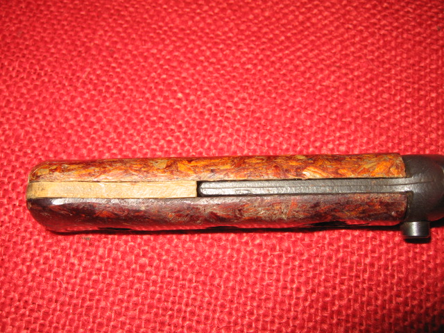 Here is another non-standard, reworked, repaired variation. Type III flat sided grip panels have been grafted onto a Type II short tang bayonet using a wood filler piece and three rivets in non-standard locations. The rivets appear to be similar to the official ones, but have been set with the wrong tools. Notice the crude appearance of the rivets. Mike
