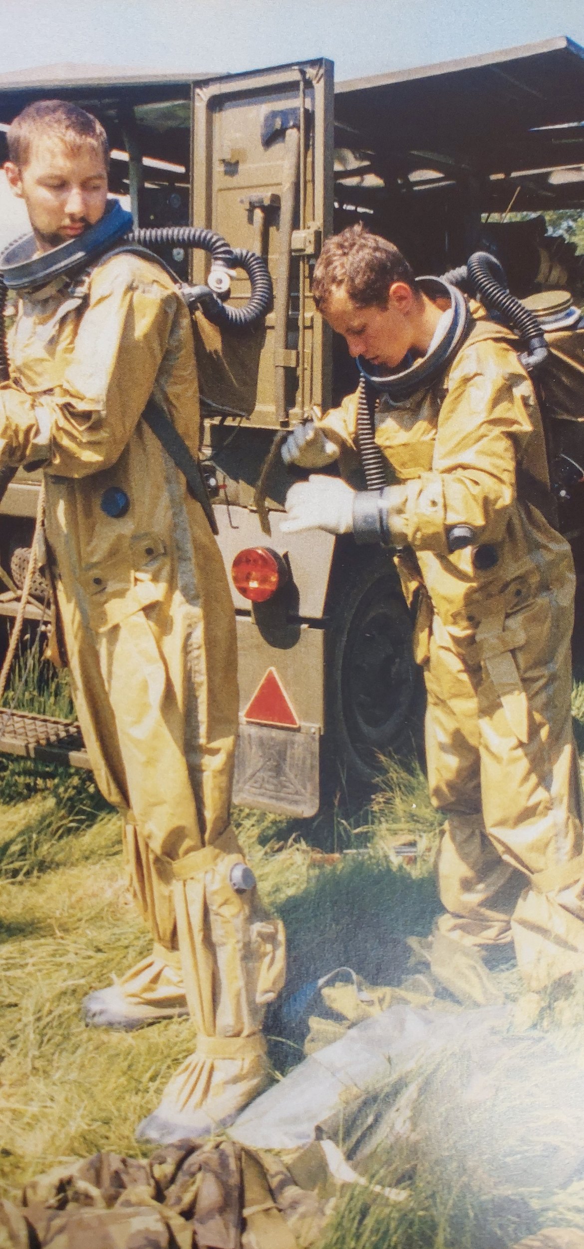 somewhat uncommon variant of the standart chemical scabbard, note the different hue of the green ruberrized canvas material