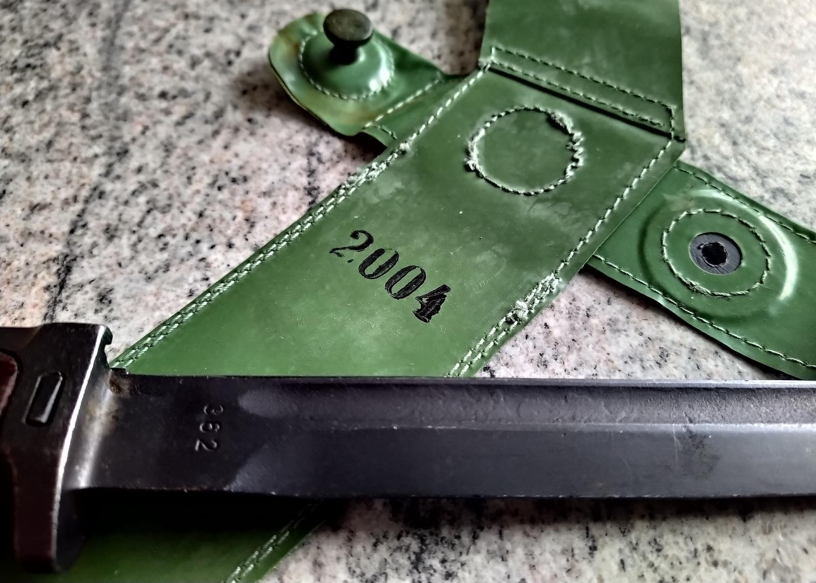 Here are a few more pictures of the GREEN VZ58 bayonet NBC scabbards along with a matching mag pouches and a belt/sling. One picture shows an assortment of markings and dates. Note that the oldest date, (1975), scabbard has slightly different stitching on the hilt strap.