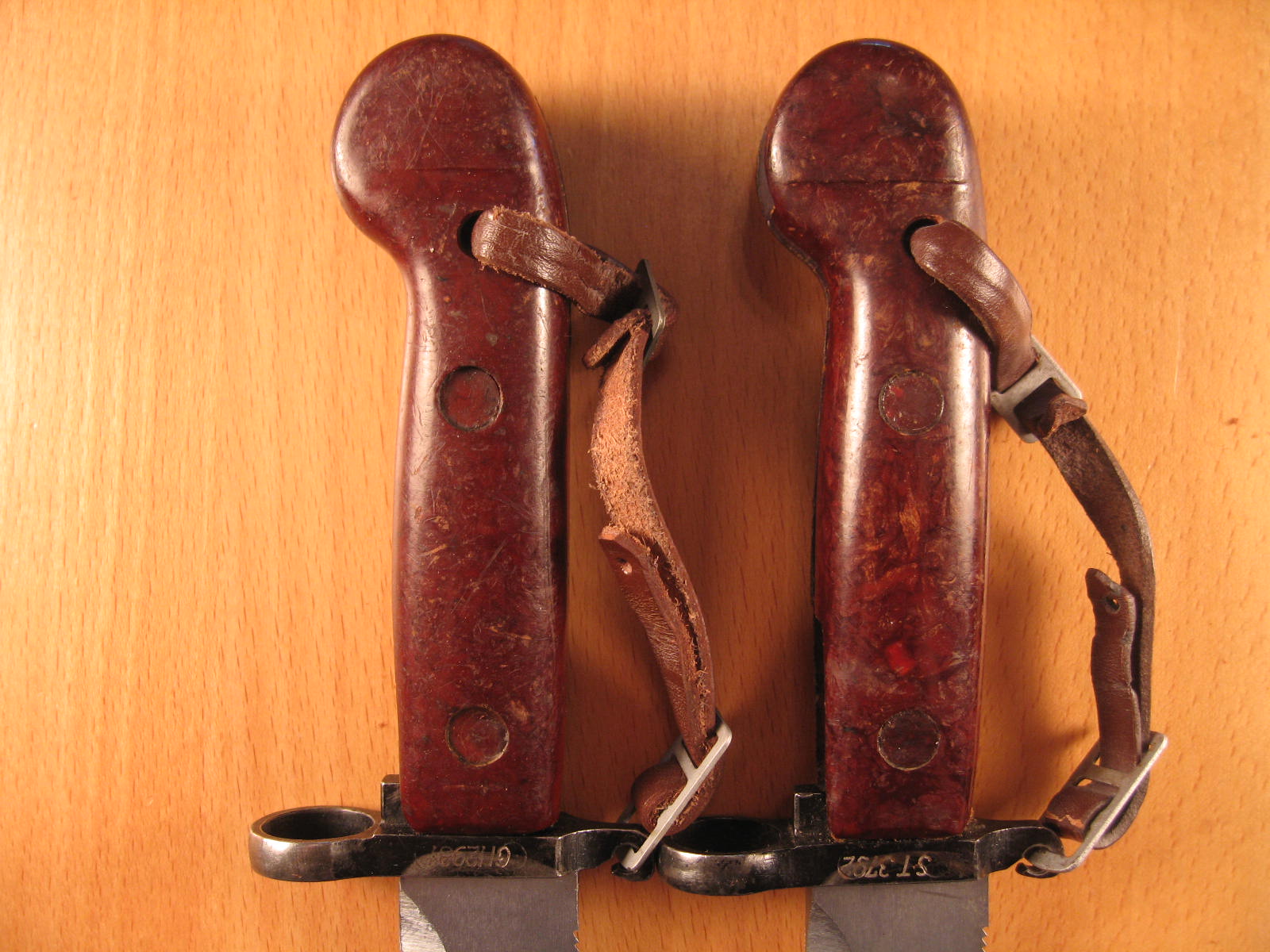 Something else to notice on flat pommel Romanian bayonets as well as the other types. Observe the wear marks on the sides of the cross guards. If there are semi elliptical marks on one or both sides one can tell if that bayonet has been worn with a one or two piece snap hook hanger and not the wraparound style ones. I have six or seven flat pommels in my possession and all of them have had the snap hook wear marks. Hanger are notorious for being switched around, but this is one way to see if the hanger/bayonet combination is "correct". M