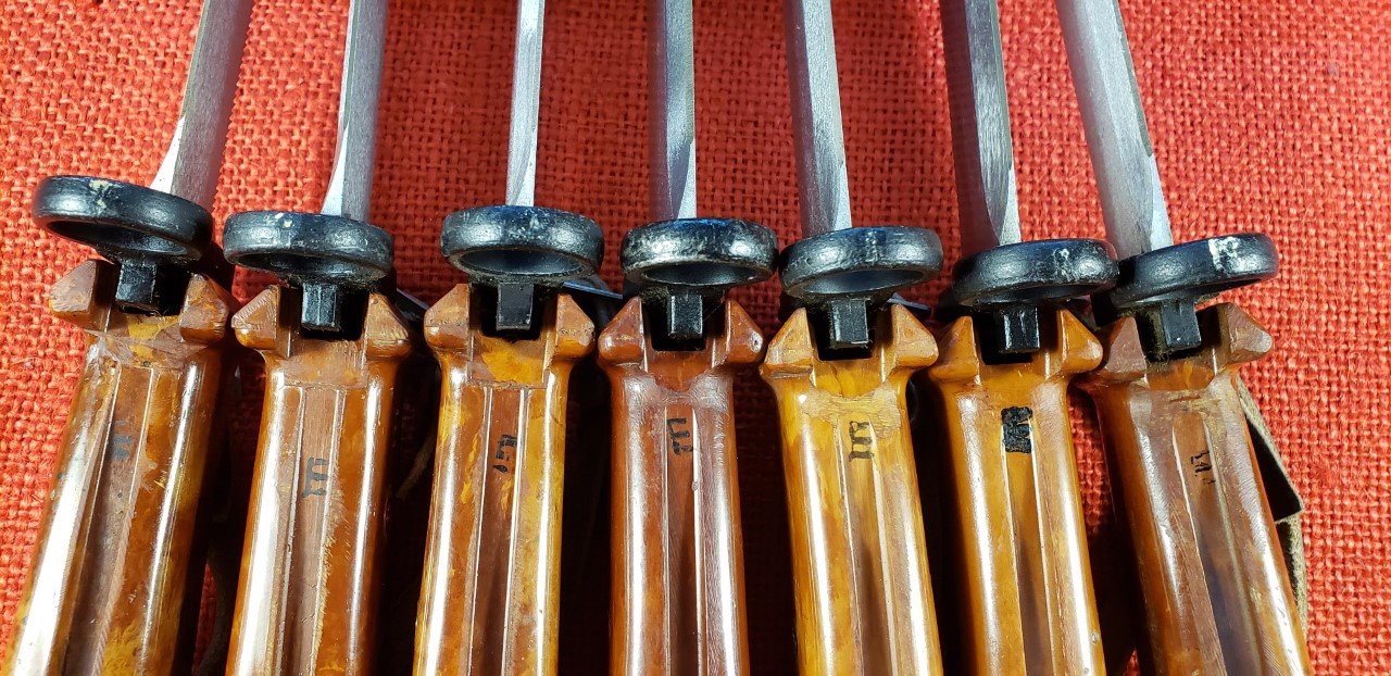 The Bulgarian AKM 6X4 Type II bayonets and scabbards display simple and consistent hand stamped paint or ink markings. These can be from manufacturing and assembly inspection or from military acceptance. I believe the white paint oval OTK and possibly the "K" are military acceptance marks similar to their Russian counterparts. The early scabbards with the flush ground welds on the cutter plate are found with a white "K" on the cutter plate stop and a separate OTK on the lower scabbard body. On later versions the was simplified to just the OTK on the cutter plate stop. Note the two later versions pictured have the hand etched matching numbers on the cutter plate. This is unusual and similar to numbering found on some Yugoslavian akm scabbards. Mike
