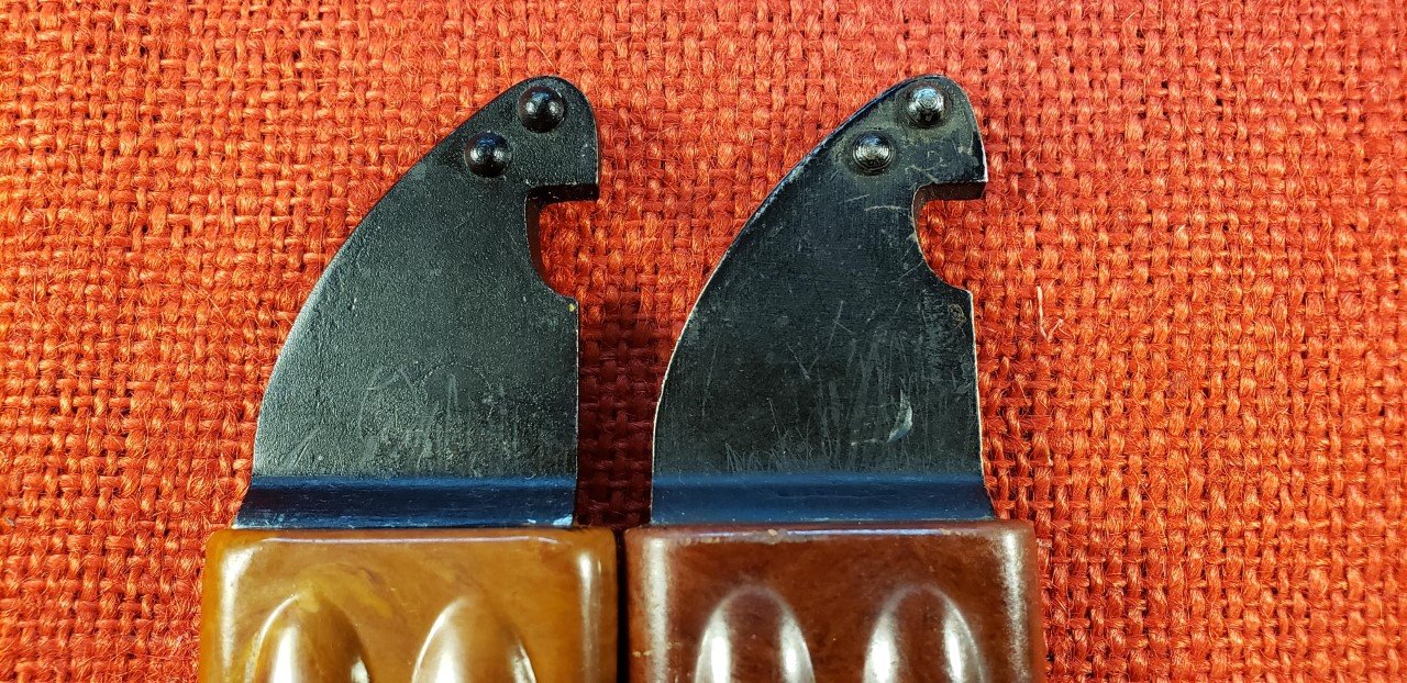 The Bulgarian AKM 6X4 Type II bayonets and scabbards display simple and consistent hand stamped paint or ink markings. These can be from manufacturing and assembly inspection or from military acceptance. I believe the white paint oval OTK and possibly the "K" are military acceptance marks similar to their Russian counterparts. The early scabbards with the flush ground welds on the cutter plate are found with a white "K" on the cutter plate stop and a separate OTK on the lower scabbard body. On later versions the was simplified to just the OTK on the cutter plate stop. Note the two later versions pictured have the hand etched matching numbers on the cutter plate. This is unusual and similar to numbering found on some Yugoslavian akm scabbards. Mike