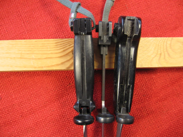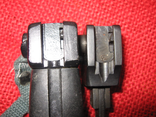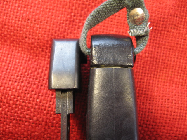 These AKM bayonets and scabbards have been around for a while. Both bayonets are identical except for grip panel color. Not much is known about them and there is a lot of conflicting information and theories. Most recently a member of this Forum mentioned a friend had seen them for sale in a Vietnamese tourist shop, so I went with that. There are others that say they were made, or assembled, in North Korea and several other countries. An other theory is that they were made up from surplus parts for the collectors and not for military use. Some known facts; The scabbards and hangers are East German (DDR) both Type I and Type II wire cutter scabbards are found randomly mixed with both color bayonets. These scabbards have all the original proofs and markings but no serial numbers, (unissued surplus). Both long and short new grey leather DDR hangers are also found mixed with the scabbards and bayonets. One theory is that the blades and cross guards are also DDR, but on close examination I am not sure about that. More on that later with pictures. Also note the black rubber insulator on the DDR Type I scabbard is rather unusual as well. Another important note is that these are AKM wire cutter bayonets, but they are NOT insulated against electrical current. They are solid metal from pommel to point. M.