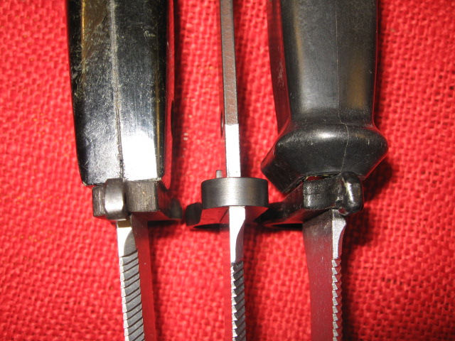 These are a series of comparison pictures between the "Vietnam" AKM bayonet and a East German (DDR) AKM 6X3 Type 1 and AKM 6X4 TYpe II bayonet. The blade tang most closely matches the 6X3 configuration right down to the holes for the grip screws. The Type II blade tang is more centrally located, has one hole and is much shorter, just past the mid point of the grips. The pommel is a completely different shape than the one inside the bulbous Type I grips. It is narrower than the Type II pommel and has a different shaped catch, oval vs flattened on one end. Also note that the release button does have the DDR circle pattern, but no slot. M.