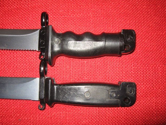 Here are some more features of the KM87 Bayonet. Note that the removable pommel contains a rubber "O" ring that fits in to a recess on the hollow grip to make it water proof. Another note, the pins on the pommel and grip that align them when the pommel is in place. Also note that the pommel is numbered to match the blade. However for some unknown reason there are no matching numbers on the scabbards. Mike