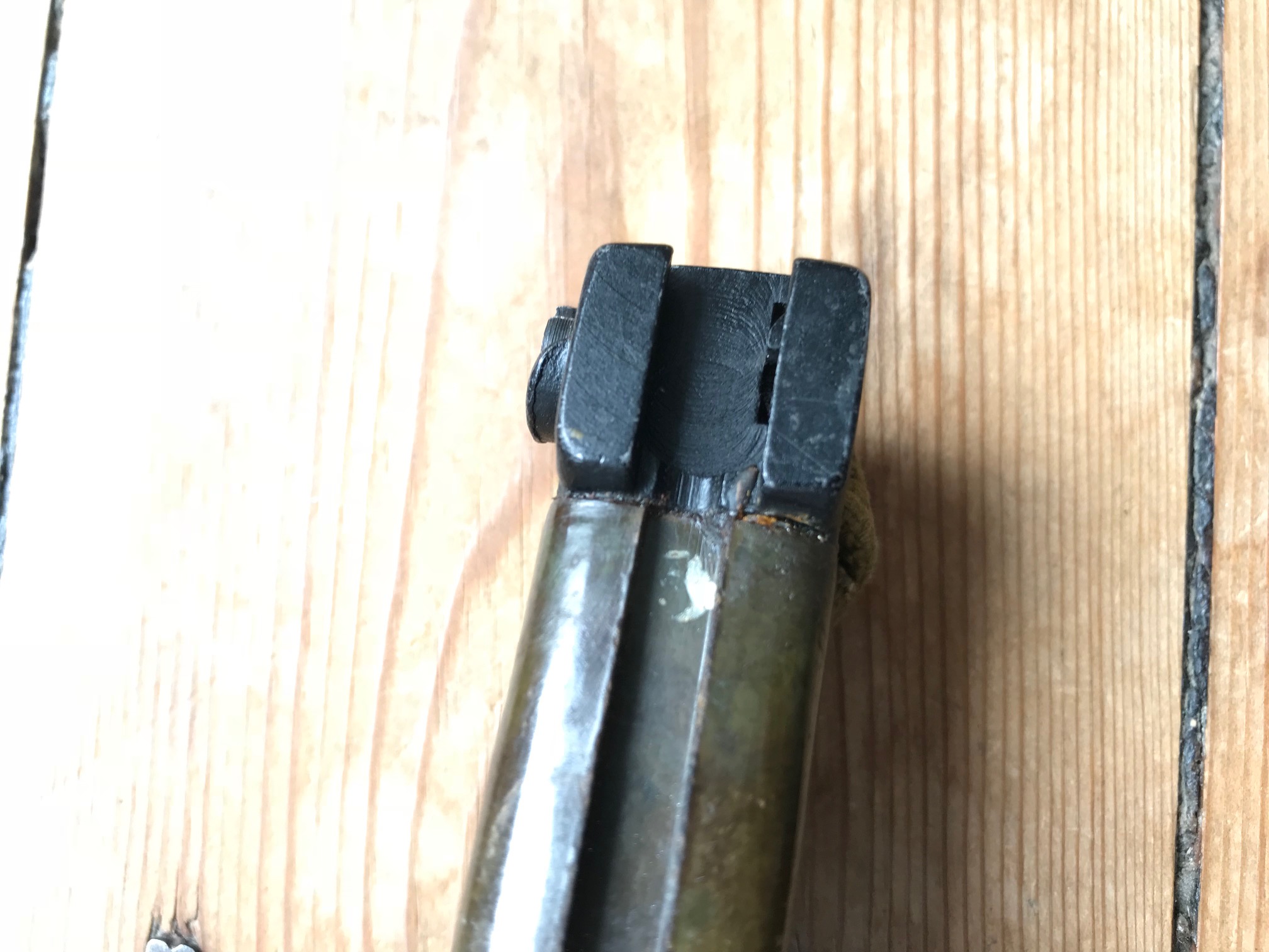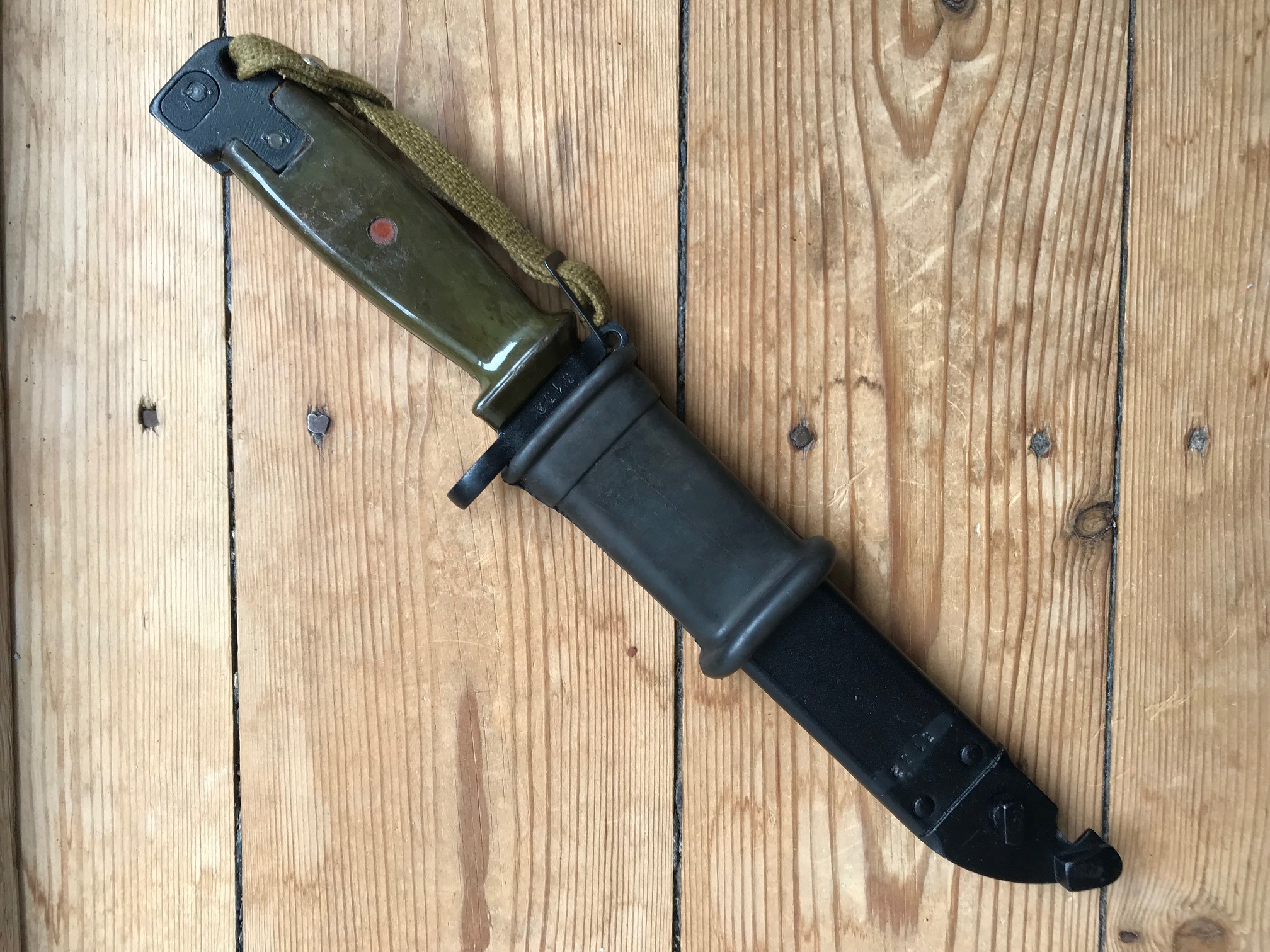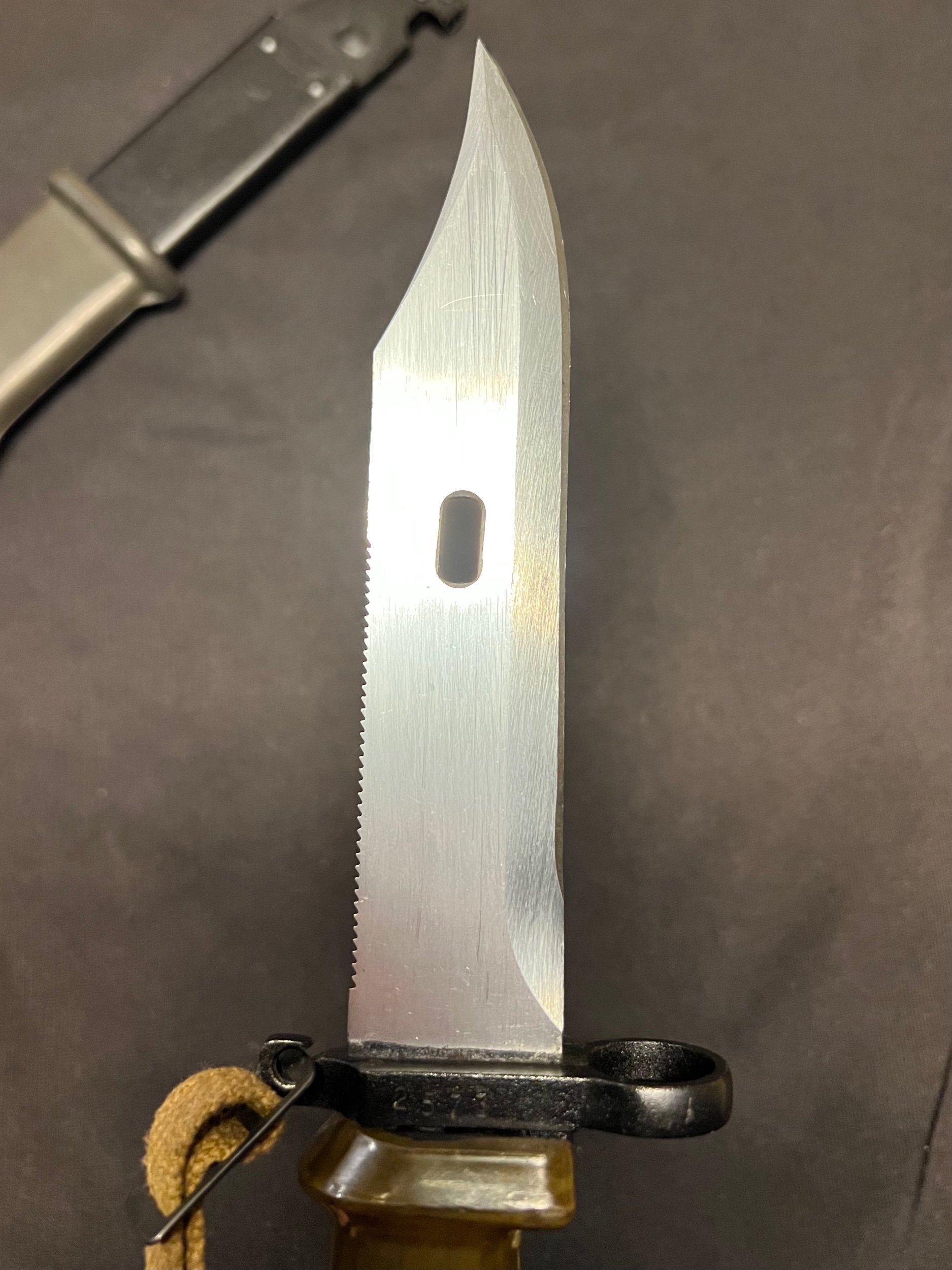 The blade shows sign of some pulling from the scabbard, but is in overall good condition. Im not sure if these scabbards were used before they ended up being paired with the border guard bayonet. The bulging on the scabbard could indicate prior use and the repainting? Im not sure. Or is it from the initial production?
