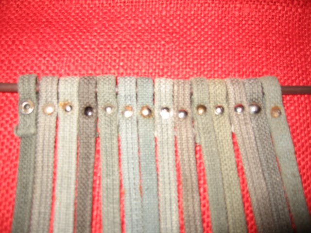 Here is what a selection of Yugoslavian AKM wrist straps looks like. I bought a large lot of new and used ones a few years ago, complete with buckles. They came in a sealed bag covered with dirt, oil and grease. II washed them in Woolite and they came out nice. I was amazed at the different colors, fabric weave and widths. Also different shapes and sizes of buckles and the rivets. Some rivets were black, copper-brass(?) and bright metal, some had washers some didn't. Note that the Iraqi AKM Tabuks used these same straps.