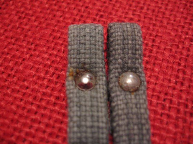 Here are a few more close ups. The 1st two show fabric color variations from light grey/green to dark green. The dark green ones seem softer than the light color fabric ones. The next two pictures are of a different unusual rivet style used without a washer. They also have a larger rivet head as compared with the more standard one shown for comparison. The last picture is of a couple with black headed rivets which to me are unusual as well. Mike