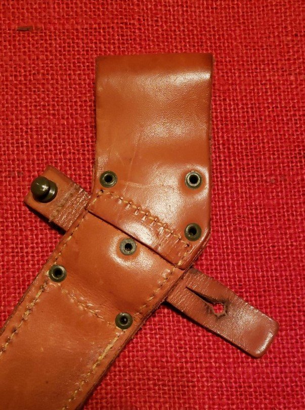 Interesting stuff. I thought you posted a picture of a left hand scabbard recently. Need to look and see if I can find who posted that and where. I am still looking for a white scabbard and a gray NBC scabbard for my collection. I have a variety of 5 and 6 rivet leather scabbards dating from 1961 to 1985, most without visible dates.