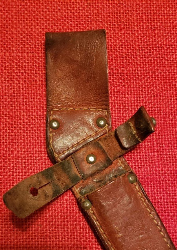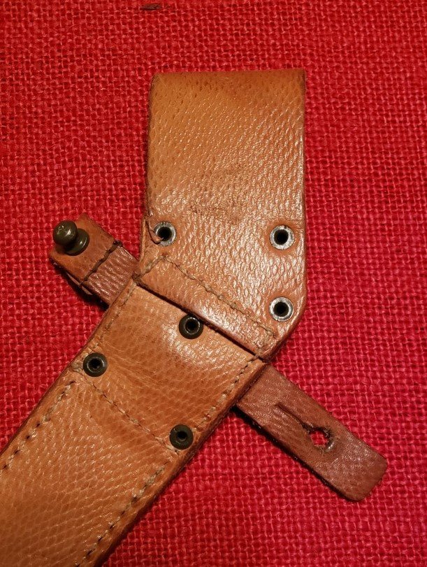 There is only one general pattern for the all the leather scabbards. They consist of either 7 or 8 pre-cut natural tan leather pieces. The pieces are layered and sewn together with light colored thread. Each is then secured with either 5 or 6 rivets. The rivets are hollow with a single domed head on the front. The rivets on the early ones are green changing to grey and black on later ones. The securing stud on the hilt strap also changes from green to grey/black as well.
