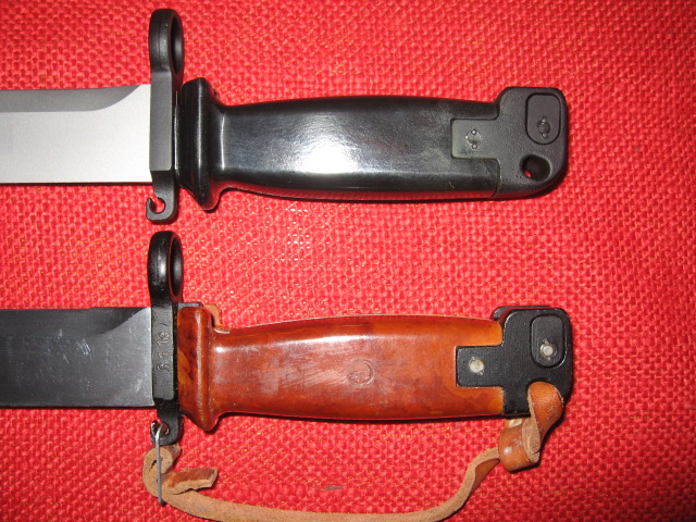 Agree, something new and different. Some observations after studying the pictures on GB. 1. The upper part of the blade tang does not extend through the cross guard as on the previous 6H4 version. This is what creates the flat, or pedestal behind the muzzle ring on the older ones. It's function was to engage a slot on the muzzle attachment and eliminate rotation of the bayonet on the barrel axis. No longer needed? 2. The top front of the black molded grip is a completely different shape in this area behind the muzzle ring as well. The grip seems to be a much more detailed plastic molding without any trimming or grinding. 3. Also noticed there are no plugs or indentions on the sides of the grip. These plugs covered the machine screw or pin that secured the grip to the blade tang. No longer needed? Different method used? Just adhesive or molded in place? Mike