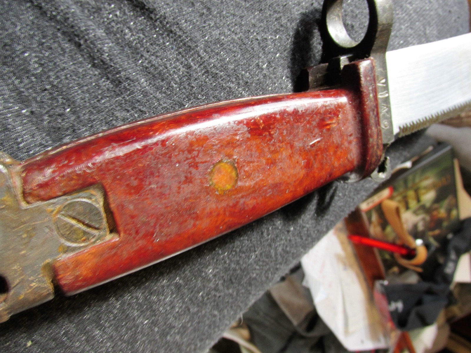 My version of this has the same grip but with a Polish style blade (no saw teeth). It has the yellow glue filled in around the gaps like the Egyptian bayonets I own. Scabbard looks to be early Maadi production made from Russian parts. Scabbard has 4 digit Eastern Arabic serial number but knife doesn't. Wrist strap is olive green with black buckle and rivet.
