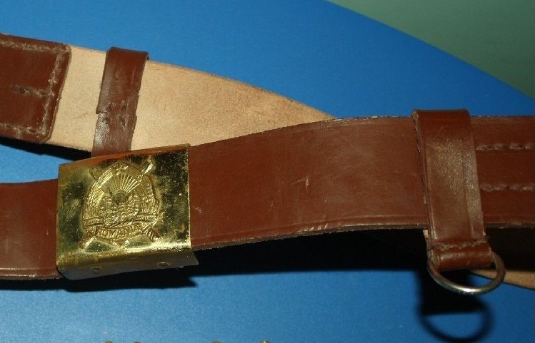 I'm not sure where to post this information. It's here because the two piece, two hook hanger is associated with the flat pommel early Romanian AKM Type Bayonets and scabbards. It seems the lower part of the hanger with the hooks is issued with the bayonet & scabbard as they have been found packaged that way. The top belt loop is more difficult to find as it is issued with the leather belt. Below is pictured a Romanian military belt with the top loop of the hanger as issued. Mike