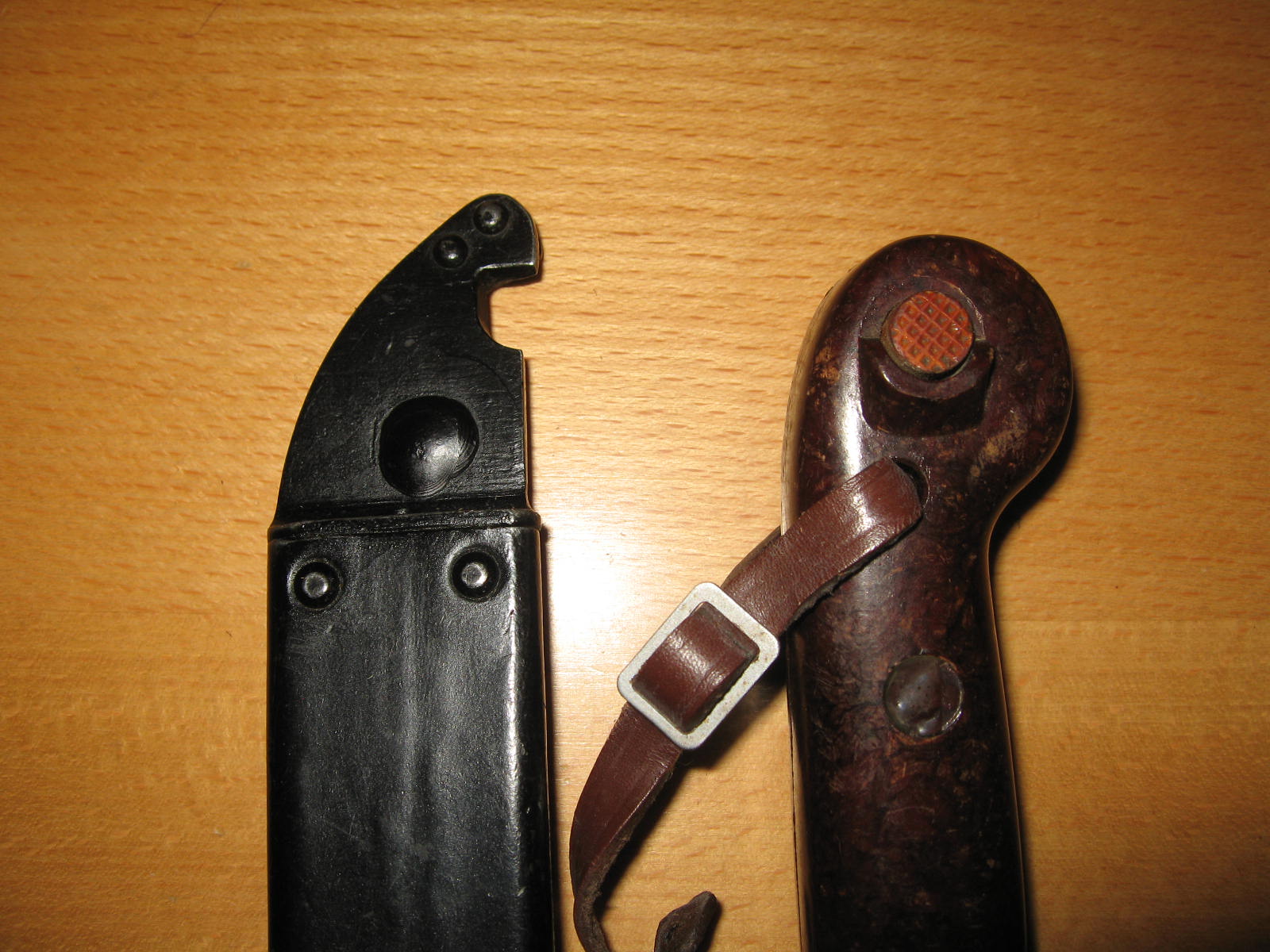 Something else to notice on flat pommel Romanian bayonets as well as the other types. Observe the wear marks on the sides of the cross guards. If there are semi elliptical marks on one or both sides one can tell if that bayonet has been worn with a one or two piece snap hook hanger and not the wraparound style ones. I have six or seven flat pommels in my possession and all of them have had the snap hook wear marks. Hanger are notorious for being switched around, but this is one way to see if the hanger/bayonet combination is "correct". M