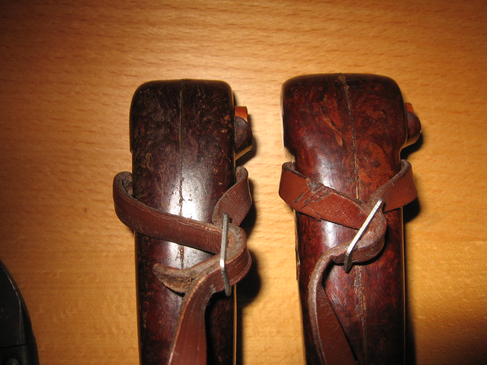 here's one last picture of the left side of the pommels. The ridge around the catch button is round in shape on the GH and more squared off on the latter version. The small ridge on the opposite side is also a different shape. M.