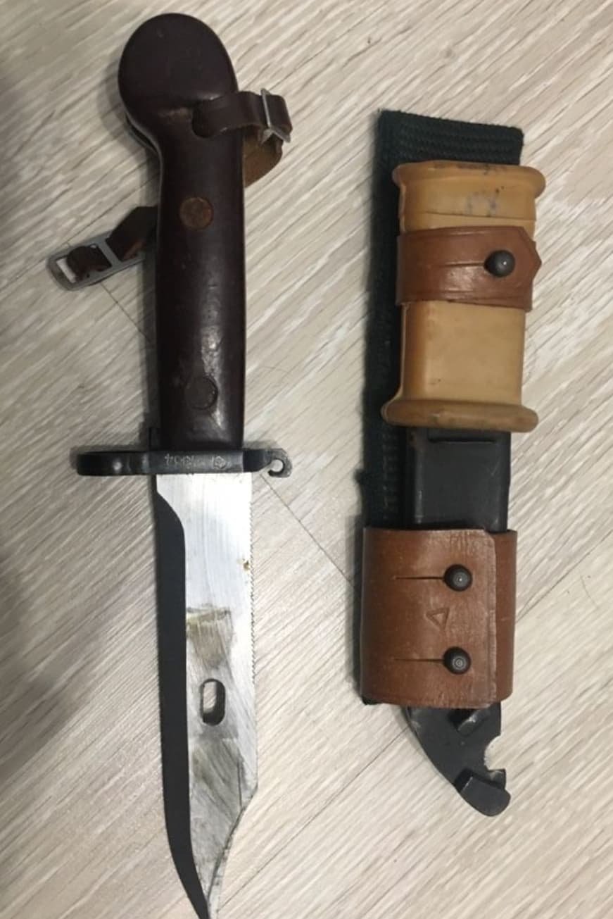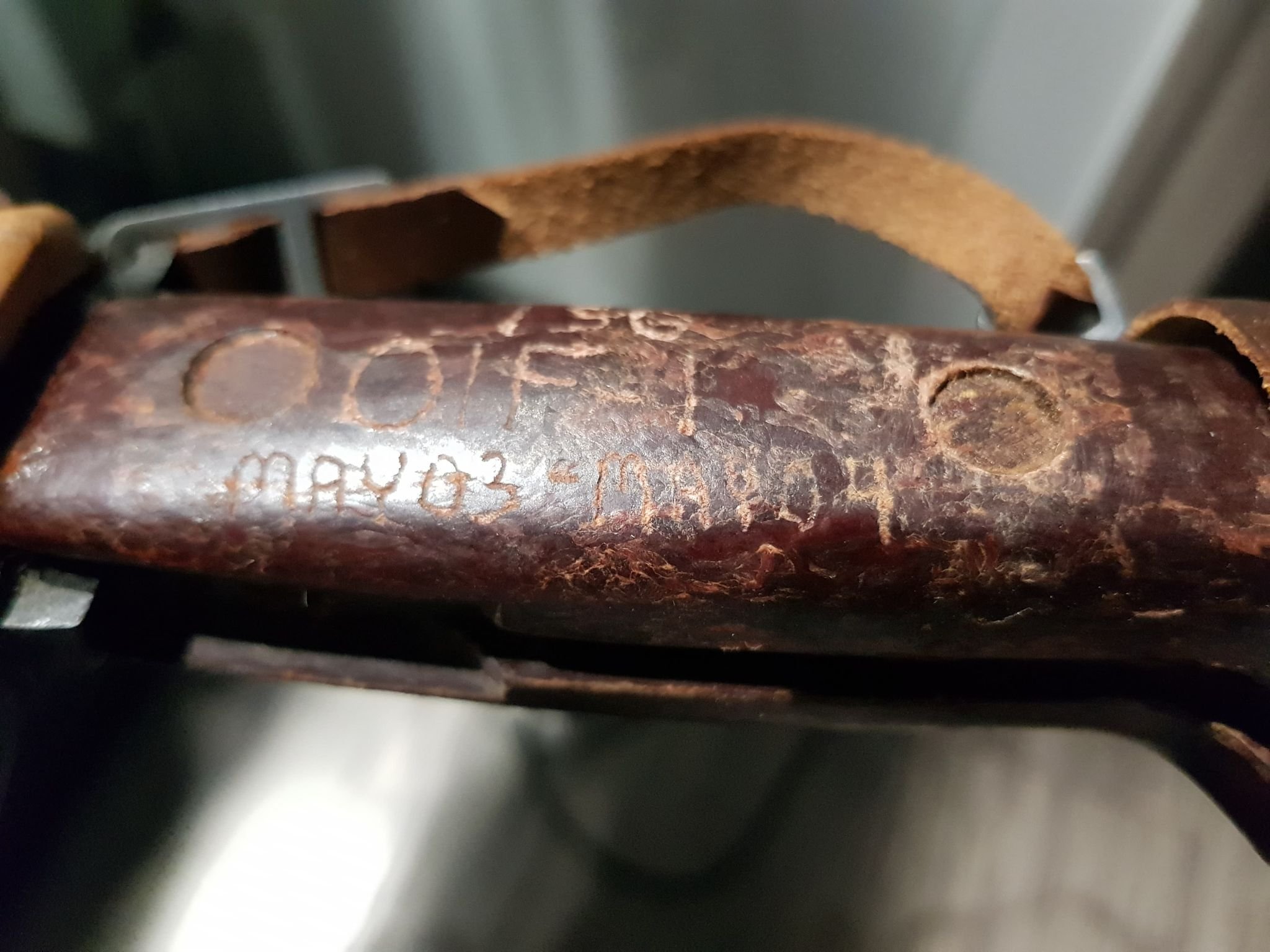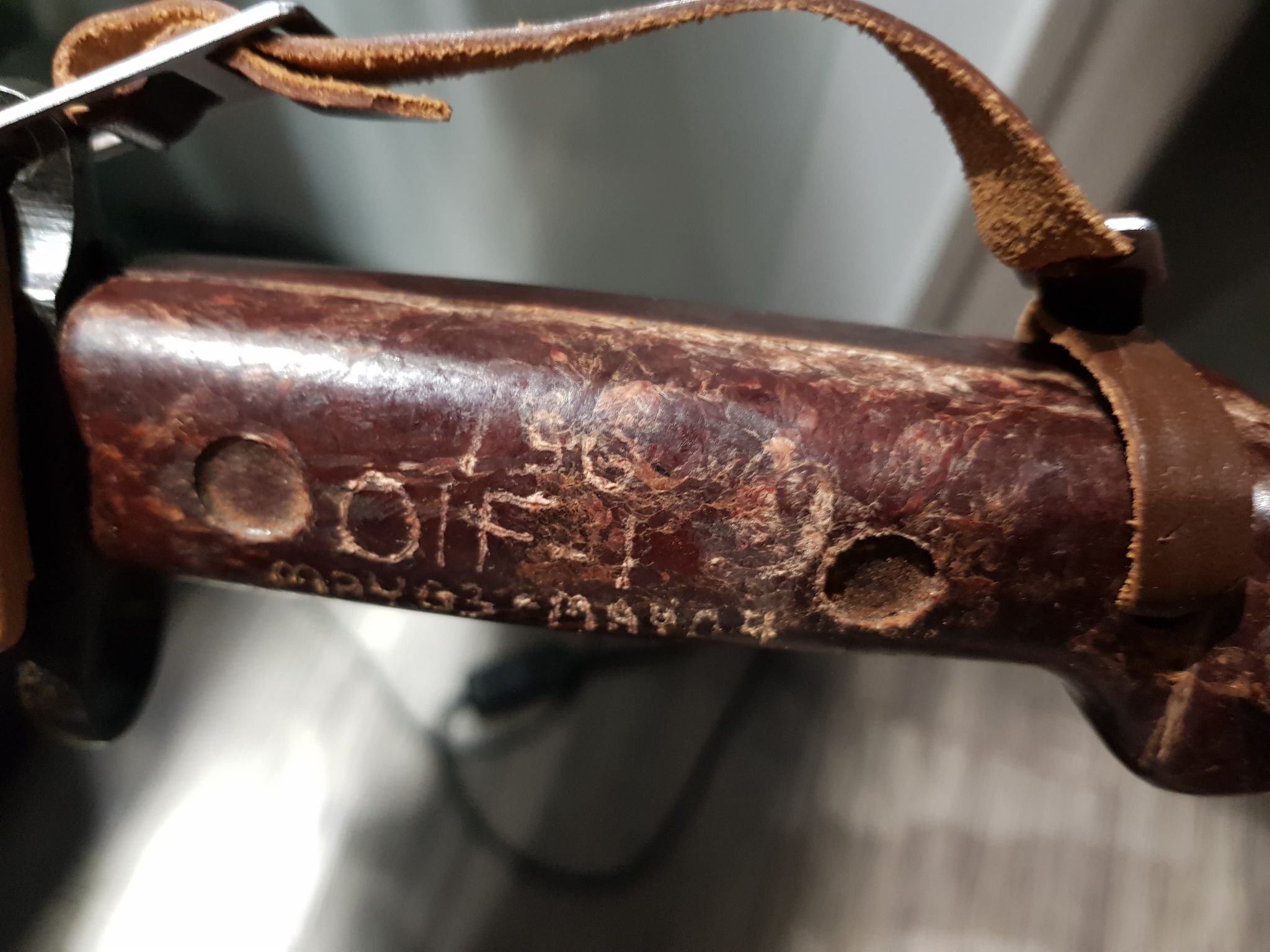 A friend in Poland, (Patryk Ees), recently sent me pictures of a Romy AKM 6X3 bayonet and scabbard. The trench art is interesting, but difficult to document. What really caught my attention was the embossed triangle emblem on the front of the scabbard hanger. Could this be Iraqi Republican Guards property marked? Has anyone else noticed the triangle on any other bayonets, scabbards or hangers? Mike