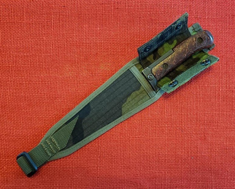 This finally came in the mail today. It is a Slovakian scabbard for the Czech VZ58 rifle bayonet, The Slovakians have their own uniforms and field gear but still use the Czech VZ58 rifles. It is all fabric and designed to attach to MOLLE gear. The bayonet hilt is secured with a wide flap with Velcro strips and two snap buttons. It is available in various colors and camo.