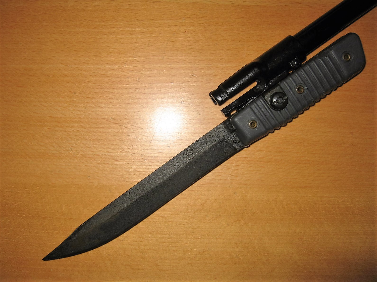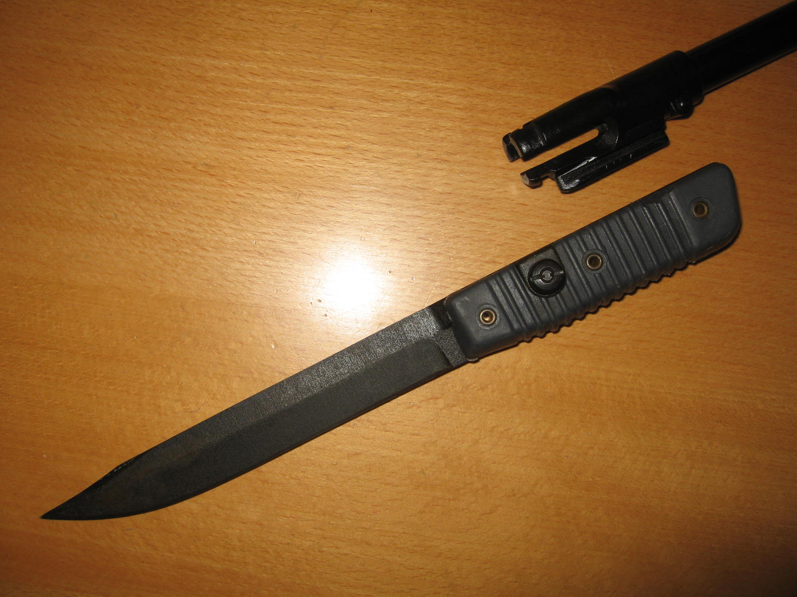 This is my Valmet. It is unmarked and has the short clip point. I do not have a Fiskars or Hackman version. I keep this one as a representative sample in a side collection as it is not a true Kalashnikov bayonet. Note the unusual means of attachment, the long bayonet mounting lug is part of the flash hider. It mounts from the front, unlike the similar Czech VZ58 which slides on from the rear. M.