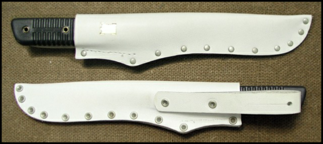 While we are on the subject of Valmet M62 bayonet and scabbard variations here are a few different scabbards that can be found. Some of the folded leather scabbards can be found with three or four body rivets and in both natural tan and green finish. Others can be found with eleven rivets. These rivets are usual aluminum or aluminum alloy. There are different types of rivets and setting. Also note that the scabbards can also be found made of green synthetic leather made of a vinyl or plastic type material,(lower picture). The last picture is a scabbard made of white leather for parade/dress usage. Mike
