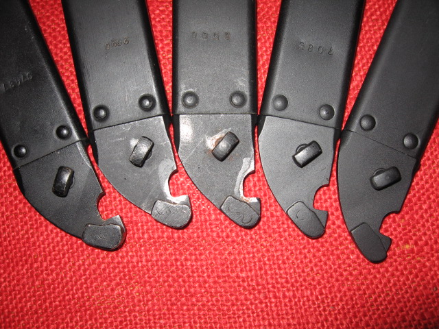 The first three on the left represent the bayonets made by Radom for the Polish military from !973 to the 1990s. These three have the Polish military proof markings. The one on the far left has the 5 digit serial numbers which carried over from the previous 6H3 production and the old style cutter stop. The 2nd from the left has the newer 4 digit numbers, but still has the old style cutter stop. The middle one has the 4 digit numbers and the new revised/simplified cutter stop. The two on the right were not made for or issued to the Polish military, but made up by Radom for the international (export) or collectors markets. The one on the left is the same as the previous military ones and may have been made up using NOS parts. The one on the right is the same basic bayonet but made of new materials and by new methods. Mike