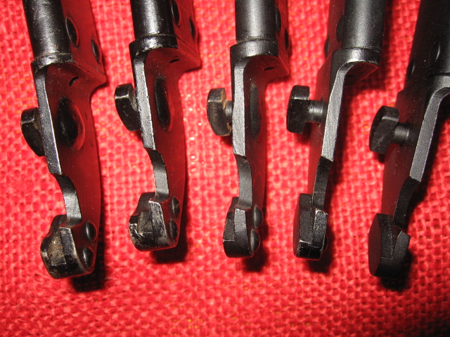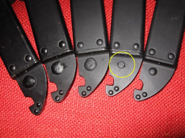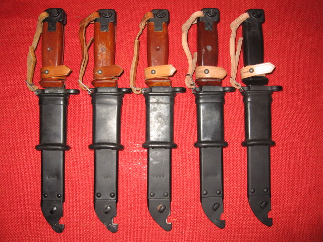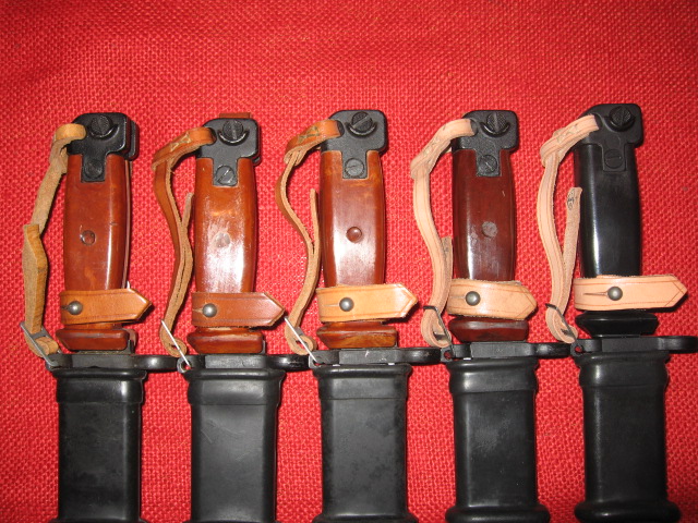 I received a package in the mail today that filed a hole in my collection. I have been looking for a late issue Polish AKM 6H4 type II bayonet with a dark brown grip for years. Finally found one. Below are five 6H4 bayonets with matching scabbards from the earliest on the left to latest on the right. The new one is second from the right. Notice that it does not have any markings except for the serial numbers. Also note that the wire cutter pivot on the scabbard cutter plate is not welded, but secured by staking/punching the threads. Mike