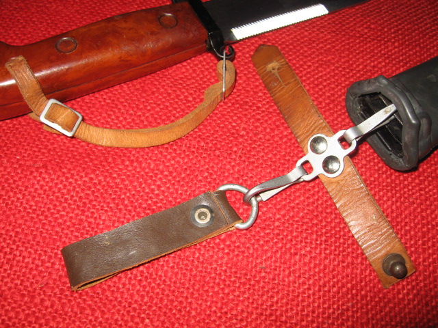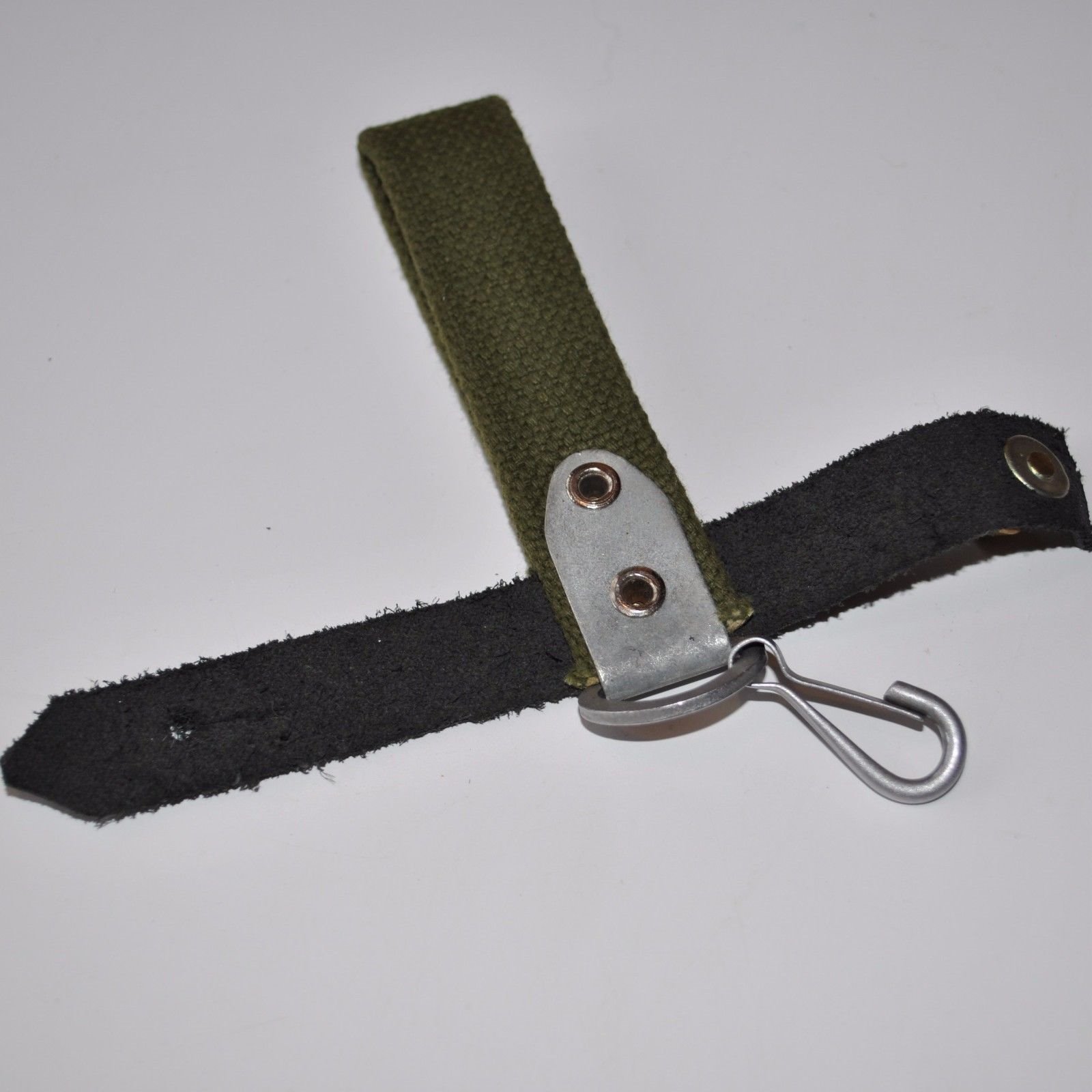 Perhaps this should have been the 1st item in this post. This is one of the 1st examples of a Russian AKM snap hook hanger. What is believed to be the original hanger was a sewn or riveted on fabric belt hanger that carried over from the Tokarev, Siminov, and AK47. This proved impractical as the belt had to be unfastened and the entire scabbard assembly removed to be able to use the wire cutter. Several different designs were tried to make the scabbard easier to remove from the belt using a snap hook. This one is the earliest one found in pictures or drawings. It used the flat bar attachment on the existing AKM scabbards. The snap hook assembly was permanently attached to the scabbard and used existing "D" ring belt loops the were part of the service belt. Later this design was obsoleted/recalled and was removed during inspections and rework. The hanger had to be cut off and the flat bar attachment modified to be able to attach a snap ring directly to the scabbard. These hangers are very rare as most were scrapped and destroyed after being cut off. M.