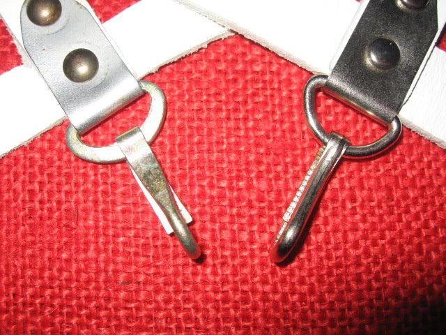 I recently acquired another early style Russian snap hook hanger. This is the variation with the metal bracket and single snap hook. The one I posted previously was made with synthetic (vinyl) leather. This one is real leather and probably the original version. They are pictured here together for comparison. The reddish one on the left is vinyl, the one on the right is leather. Mike