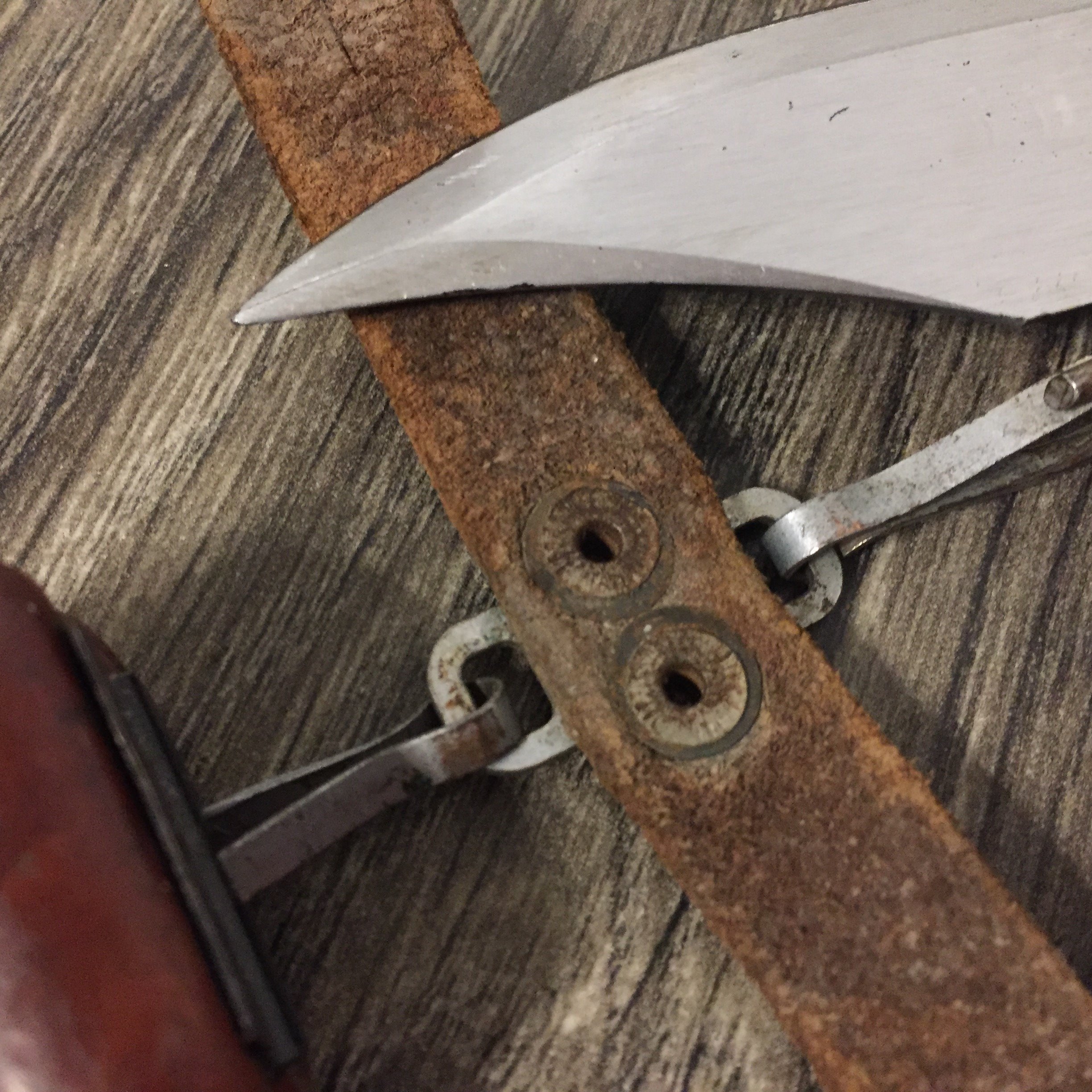 I recently received these two snap hook hangers from Ukraine. I am not sure what they are, but the appear to possibly be early attempts at a one piece hanger. They use the same unusual snap hook and "D'" ring shown in the early manuals and found on the earliest permanently installed leather snap hook hangers. The leather and rivets are also consistent with the first version. However, they may also just be made up from spare parts to be used as replacements on reworked/inspected bayonets and scabbards. Either way, unusual Russian snap hook hangers.