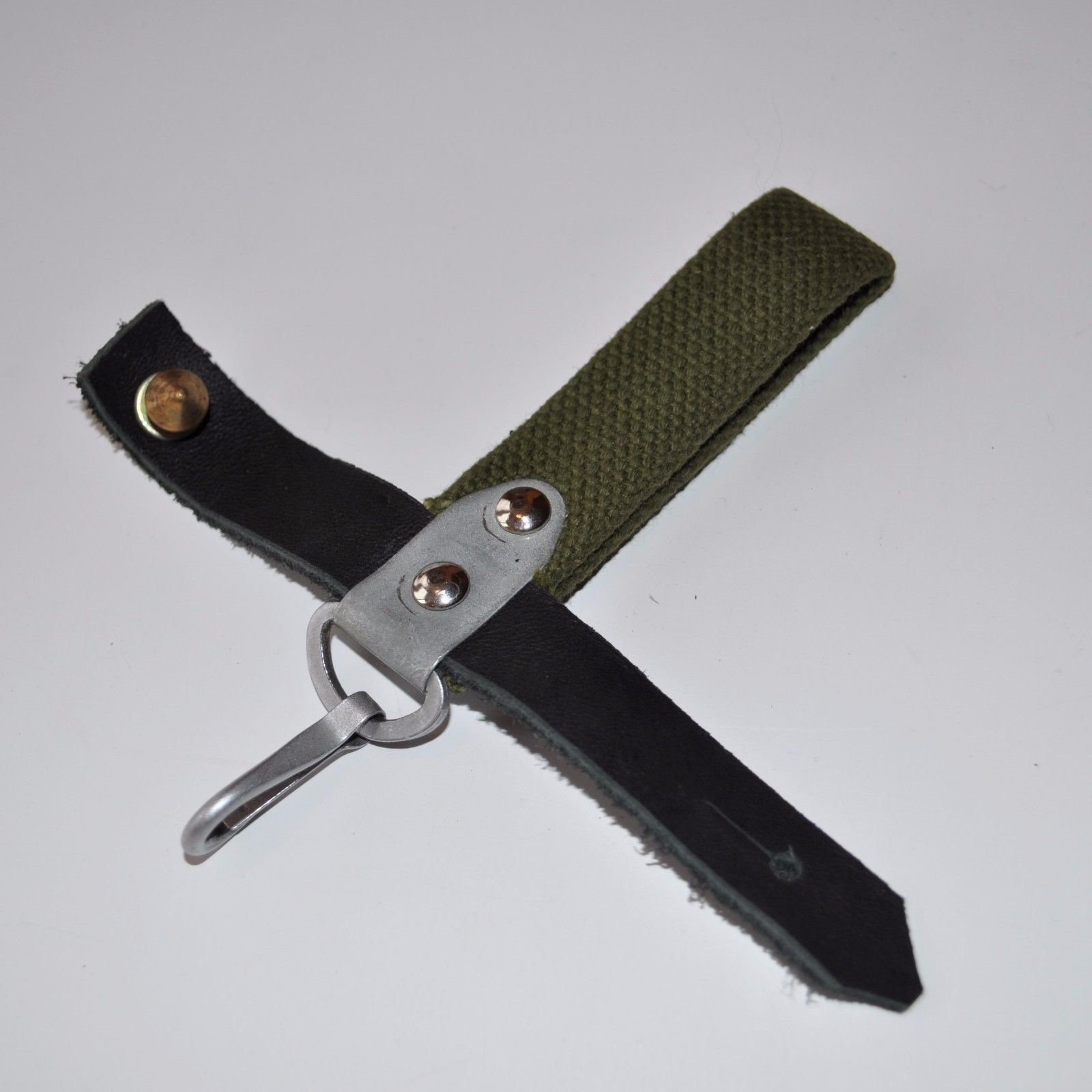 Here's another early Russian AKM 6X3 Type I hanger. I believe this one should have been before the one above chronologically. This one is probably the first attempt at a two snap hook hanger. The one I my collection, pictured below has two "D" rings, but only one snap hook. In place of a second snap hook is a riveted together belt loop at the top. I have seen a similar hanger with second snap hook at the top in place of the attached belt loop. It would require a separate belt loop with a "D" ring. Shown with an optional "D" ring and snap hook in the last two pictures. Notice the similarities to the illustration from the Russian AKM manual previously in this series of posts. Displayed below with an early reworked Tula Type one with a matching number early scabbard with a modified flat bar hanger bracket. Also note the 2 buckle wrist strap.