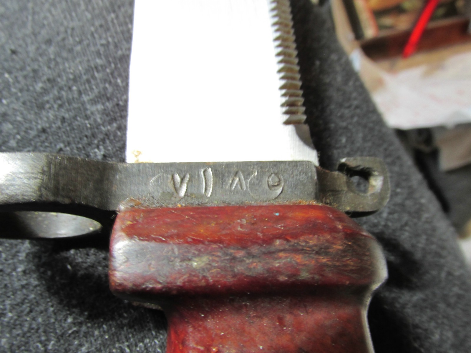 Another thing in common is that many of them have 4 digit Eastern Arabic numbers either stamped or etched on the bayonet crossguard and scabbard body. They are in the same relative position and orientation. These numbers are similar to the ones found on the early Egyptian bayonets, (brown grips?).