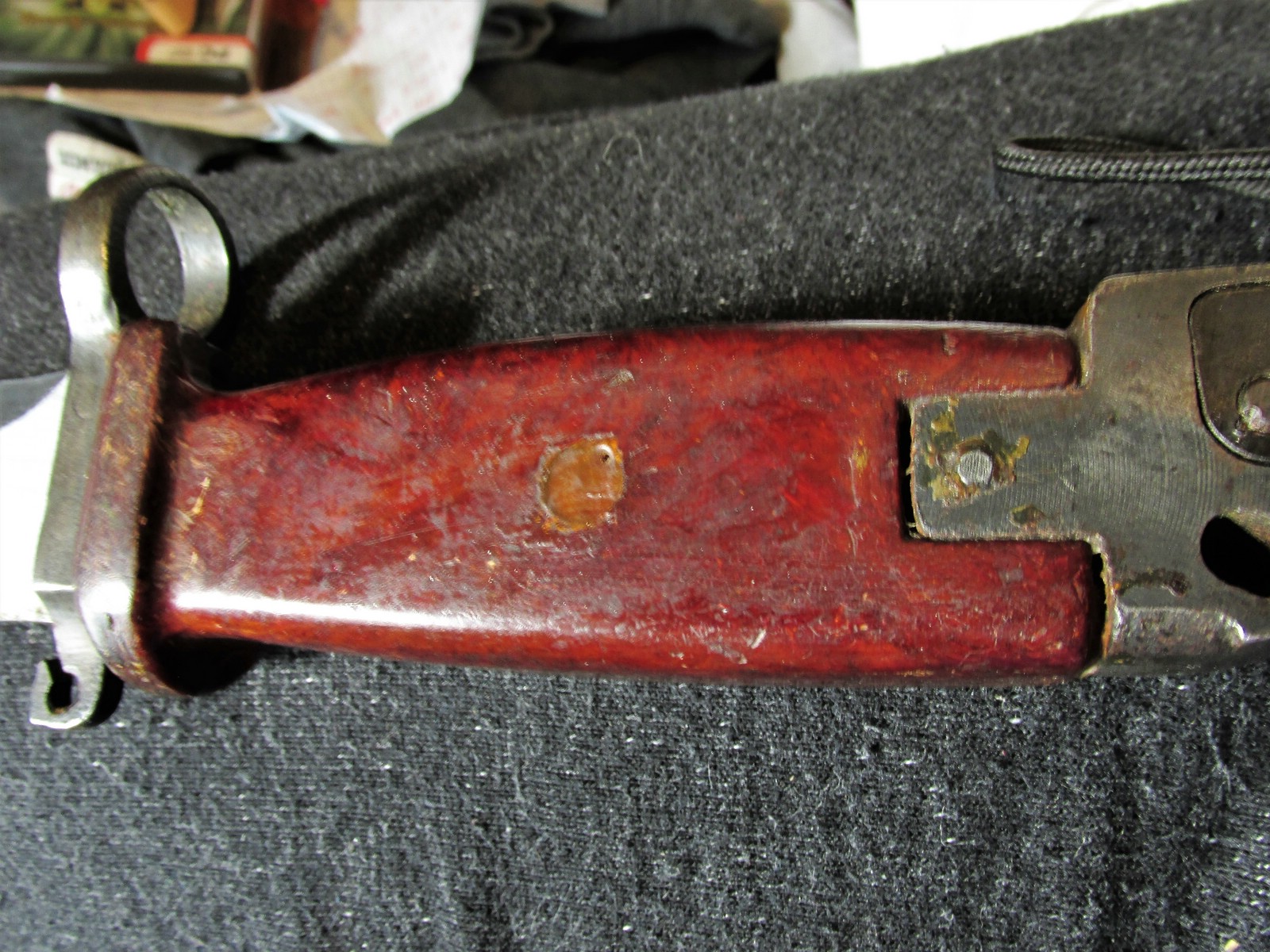 My version of this has the same grip but with a Polish style blade (no saw teeth). It has the yellow glue filled in around the gaps like the Egyptian bayonets I own. Scabbard looks to be early Maadi production made from Russian parts. Scabbard has 4 digit Eastern Arabic serial number but knife doesn't. Wrist strap is olive green with black buckle and rivet.
