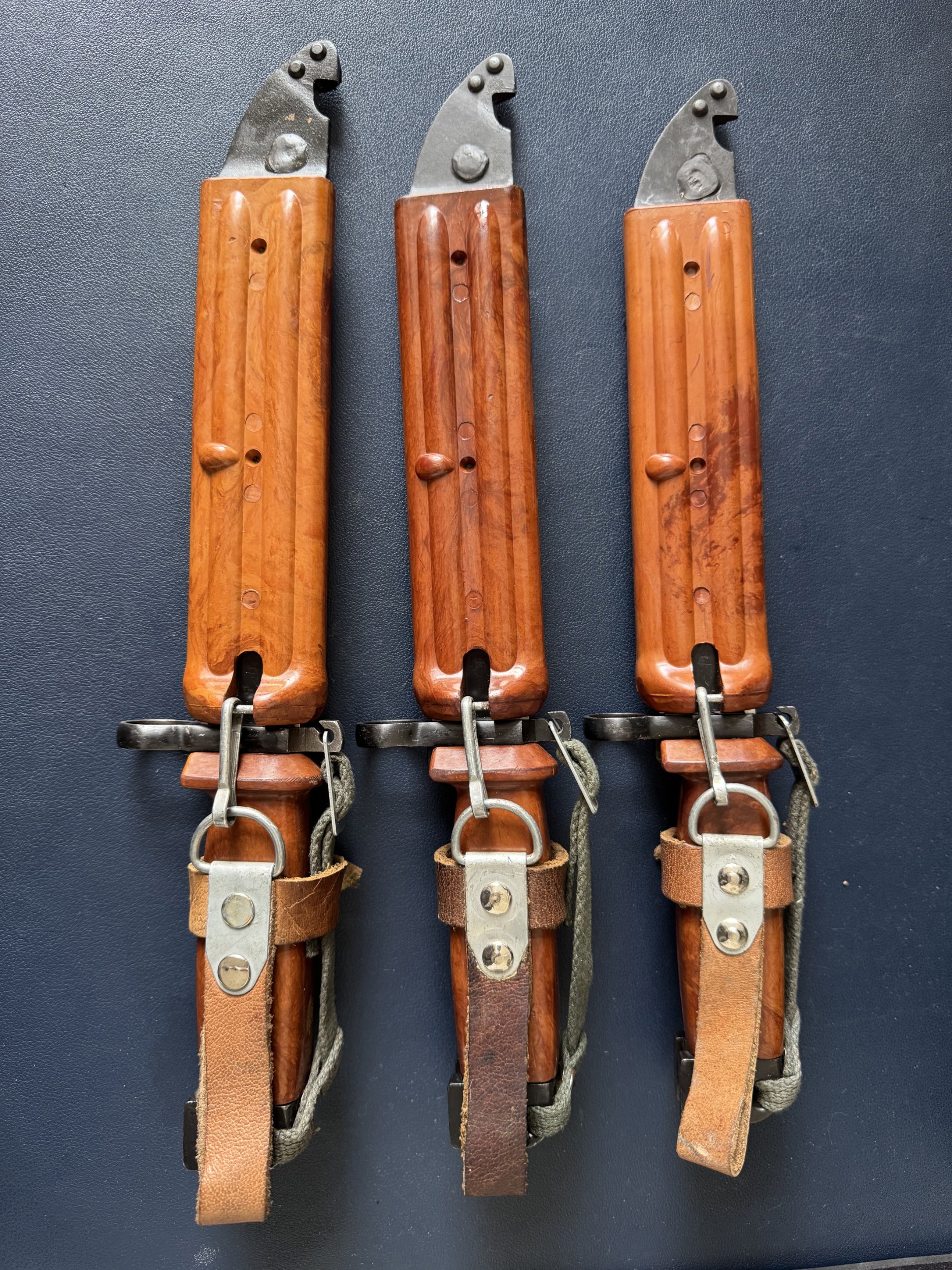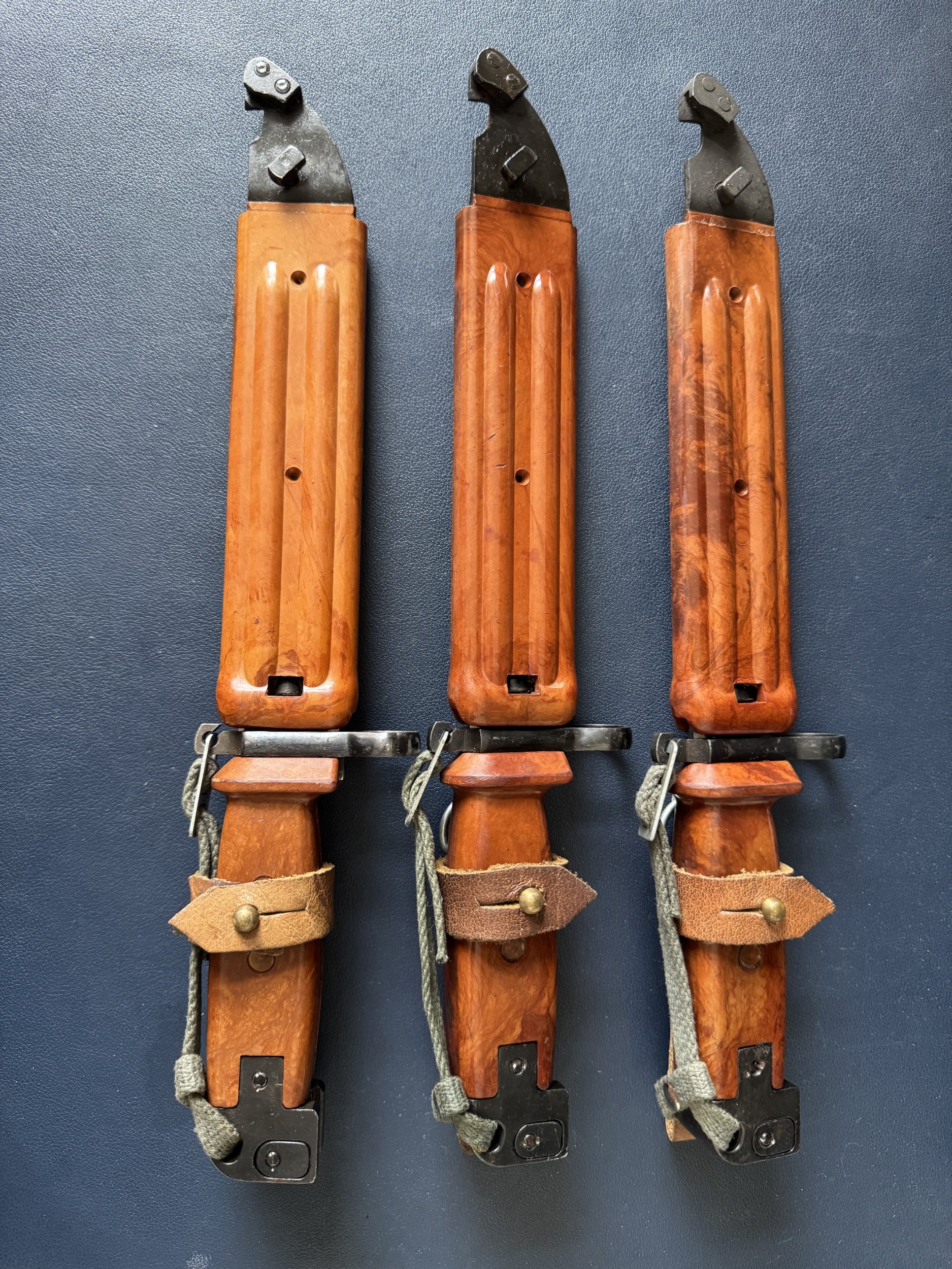 Three of the Tabuk bayonets have original sheaths and lanyards, but the sheaths are not numbered, and one red Tabuk has a Soviet sheaths