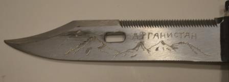 Thought I'd start this section with one of the more interesting blades in my collection. This is an Afghan War period piece with some interesting "Trench Art". The blade has a mountain seen and the word "АФГАНИСТАН" (Afghanistan) carved into it on the right side. On the left side of the blade "103-й" over "ВДД" for 103rd Airborne Division is written in black ink. (Note - this should be 103-я for 103rd but the soldier's language skills might not have been that great). The knife is the variation without factory mark that may have been made by a subcontractor and is oft scene with reworked bayonets.