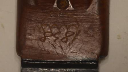 The original serial number on the scabbard has obviously been ground off and the new serial number "1838" inscribed which matches the inscribed serial number on the knife handle. The artwork has obviously been inscribed over top of the new serial number on the scabbard.