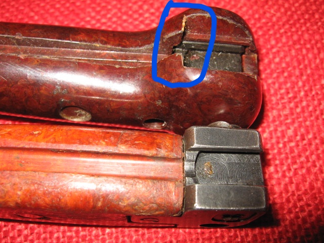 I had not noticed this before. But, I have two that look like picture number two, and one like picture one. Mold numbers on the first two are 1-2, and on the different one, 1-1. So assume that would be the difference. On an unrelated note, the AK74 or whatever one calls it, is really a poor design of bayonet-- the blade design is interesting, but the tang only goes halfway through the grip (right about the second finger ridge). I have one that was broken in half at this point. The earlier AKM Type 2 was a much better knife.
