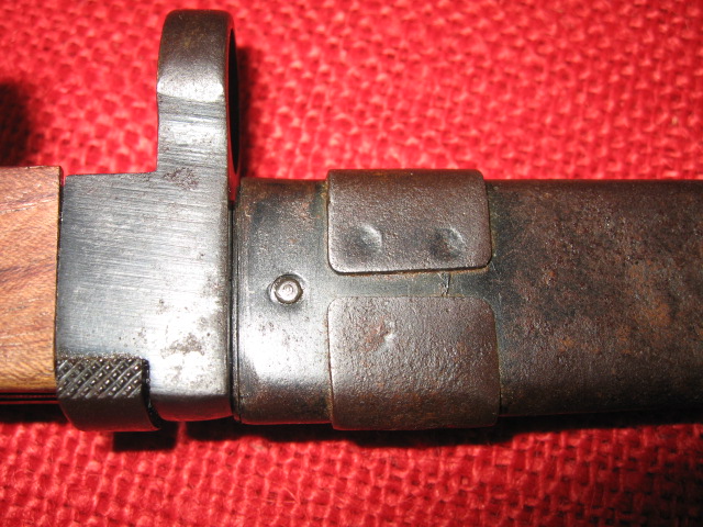 Here is a better picture of one of the swastika bayonets and scabbards. It goes with the closeup picture of the marking that is roughly stamped on the cross guard retaining pin/rivet. Note that due to the heavy marking stamp on the pin/rivet, that it has been driven out of position on the opposite side and protrudes slightly. I wonder why they would choose that position to stamp a marking after grinding the pins/rivets flush. Perhaps the swastika stamp was applied as an after thought at some point in time after it was made? Mike