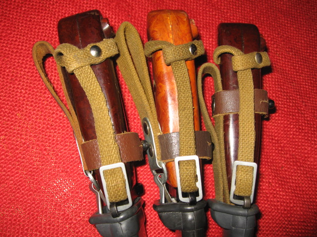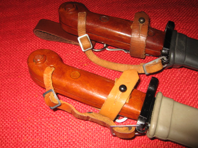 The riveted leather loop strap replaced the first two variations. and is found on most of the original and reworked Russian 6X3 bayonets. it can be found in a variety of leather textures and colors from natural tan to black and also grey and green shades. They also vary in width and thickness. Some can occasionally be found with the black buckles. Some people believe these are early ones, but yet the earlier two buckle straps appear to have had bright metal buckles. Below are couple of mine with black buckles. Mike