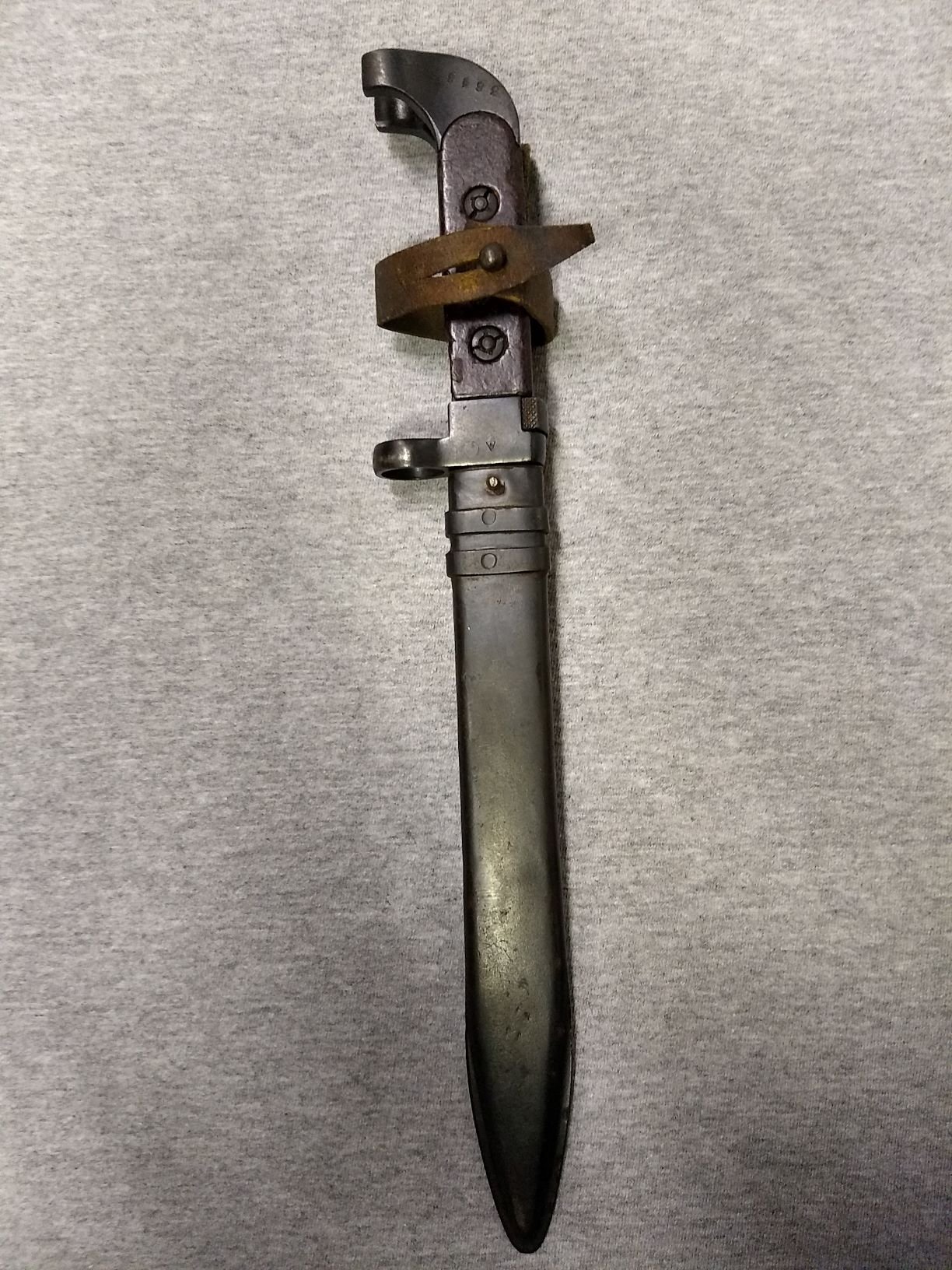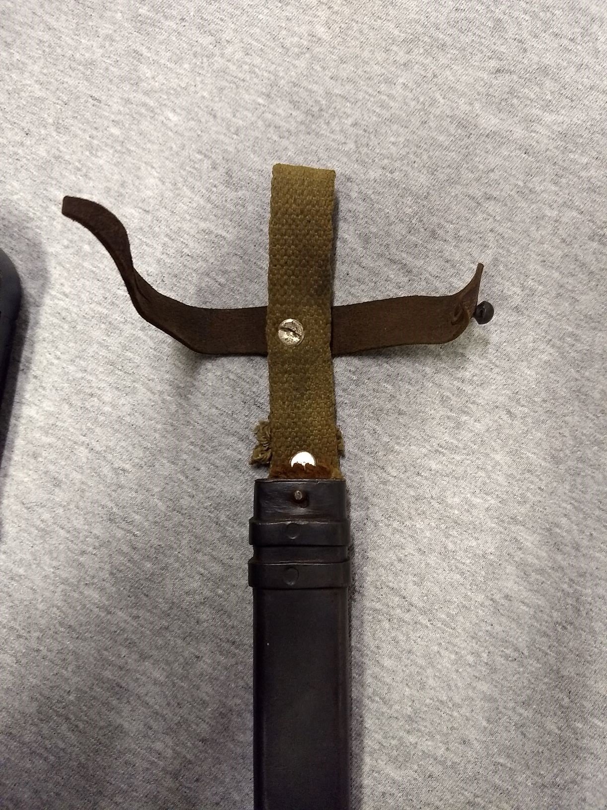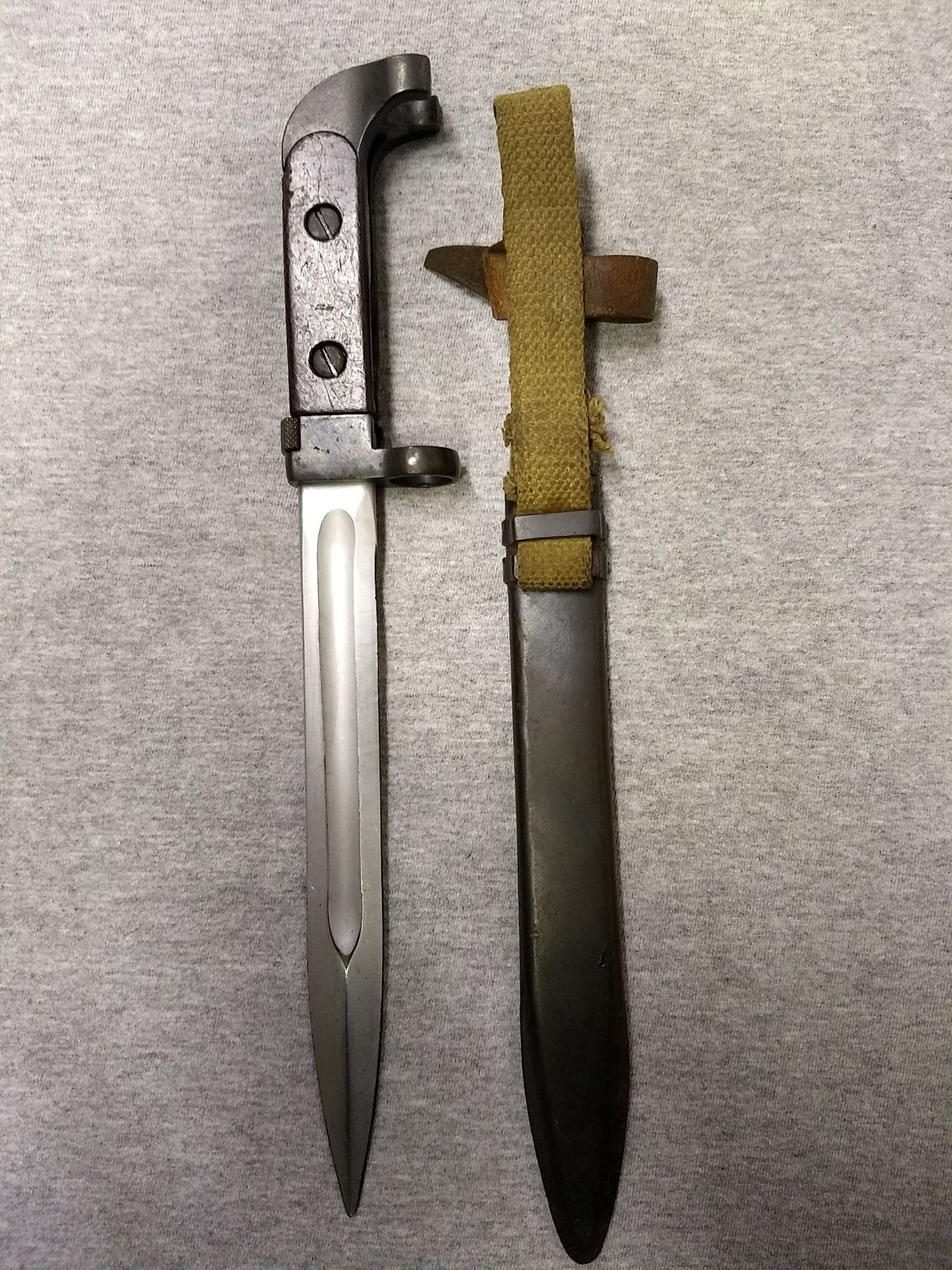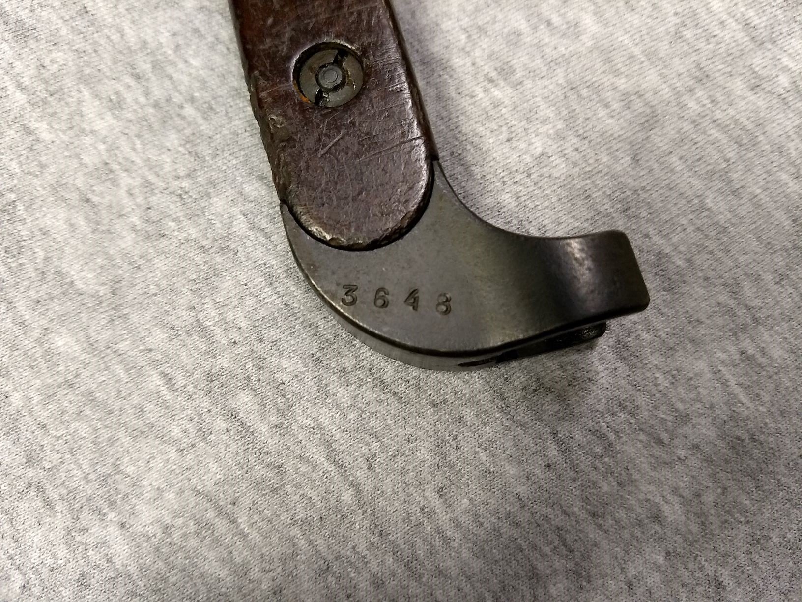 I agree, export variation. Usually I consider them either 1st or 2nd contract to Finland due to the style and placement of the numbers. The 1st contract had the 2 bar scabbard, the later contract had the one piece sheet metal hanger bracket. Both had the fabric hanger sewn to the leather hilt loop. Since the hanger on this scabbard is replacement, no confirmation. I also had questions as it was obviously issued and well used. I far as I know the Finland never issued or used these AK47 bayonets. Most of the ones I've seen are in new condition. Perhaps Finland sold or trade them to another country. Did Russia also provide these complete bayonet to other countries? I do know they supplied parts to other ComBloc countries as they began production. Completed ones exported to Egypt, Cuba, Hungary, etc. or other countries? I've always wondered, how would they be identified? Mike